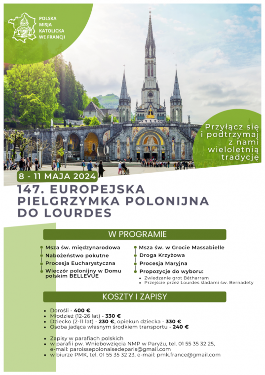 Zapisywać się można w polskich parafiach we Francji, w paryskiej parafii na „Concorde” (e-mail: paroissepolonaisedeparis@gmail.com, tel.: 0155353225) oraz w biurze PMK (e-mail: pmk.france@gmail.com, tel.: 0155353223).