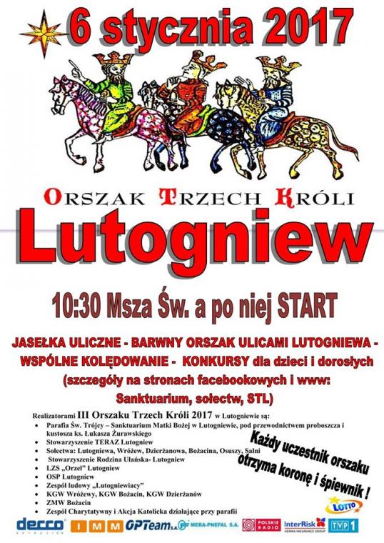 Małe i wielkie miasta, wioski włączają się w wielkie świętowanie- Orszak Trzech Króli. W tym roku po raz trzeci Orszak Trzech Króli wyruszy ulicami niewielkiego  Lutogniewa. Zanim jednak wyruszymy na ulice Lutogniewa pokłonimy się Bożej Dziecinie  w Sanktuarium Matki Bożej Pocieszenia. Tu o godz. 10:30  będzie sprawowana Eucharystia, a po niej czas wspólnego radosnego świętowania. Atrakcji nie zabraknie będą uliczne jasełka, wspólne kolędowanie, barwny korowód  ulicami Lutogniewa. Jego atrakcją będzie z pewnością wielbłąd. Jaki? Przyjdźcie, zobaczycie. A dla każdego uczestnika orszaku korona i śpiewnik. Zapraszamy!