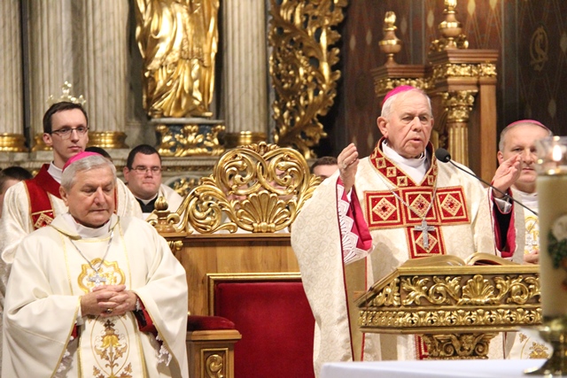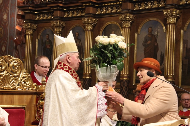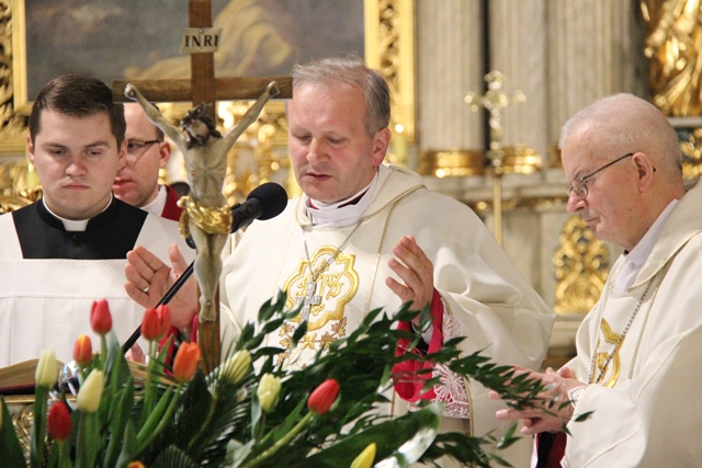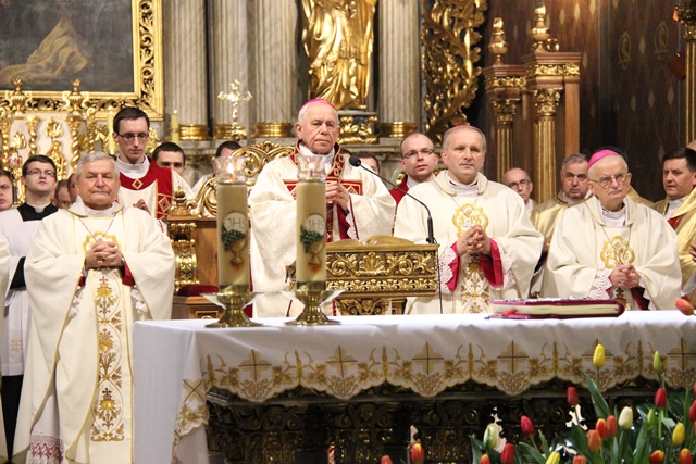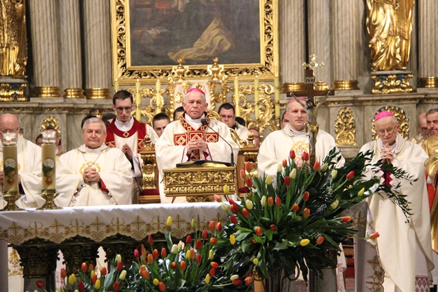Witając biskupów, duchowieństwo i wiernych biskup kaliski Edward Janiak wskazał na św. Józefa, Opiekuna diecezji kaliskiej. - Z głębi serca pragniemy dziękować dobremu Bogu za wszystkie łaski, jakie nasza diecezja dostąpiła przez tę historyczną decyzję Jana Pawła II. Nadanie patrona św. Józefa całej diecezji to nas jeszcze bardziej zobowiązuje, bo mamy Opiekuna Kościoła Powszechnego jako naszego Opiekuna – podkreślił bp Janiak. Akcentował, że diecezja kaliska to nie tylko obiekty, ale przede wszystkim żywy Kościół. - Ks. Biskup Stanisław kierował Kościołem Kaliskim przez 20 lat i to jest piękny dar łaski Bożej, że może stanąć przy ołtarzu jako ten pierwszy świadek. Naszym obowiązkiem jest, abyśmy ten Kościół przekazali następnemu pokoleniu w nie gorszej kondycji duchowej – zaznaczył ordynariusz kaliski.