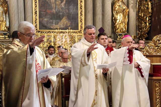 Na początku Eucharystii ks. prał. Adam Modliński powitał biskupów i kapłanów. Przypomniał, że w tym roku diecezja kaliska świętuje jubileusz 25-lecia powstania. – Wczoraj, 12 kwietnia, minęło 25 lat od uroczystego ingresu pierwszego biskupa kaliskiego do katedry – powiedział proboszcz katedry. Dodał, że od 1992 r. dla diecezji kaliskiej wyświęcono 305 kapłanów. Wspomniał też zmarłych księży. Zaznaczył, że w ciągu 25 lat istnienia diecezji kaliskiej odeszło do Pana 169 kapłanów. Pozdrowił również jubilatów obchodzących 60., 50. i 25. rocznicę święceń kapłańskich. Zaznaczył, że księża zgromadzeni w kaliskiej katedrze łączą się duchowo z kapłanami przebywającymi poza granicami kraju.