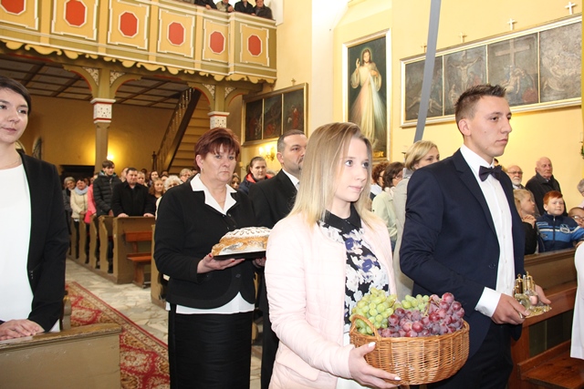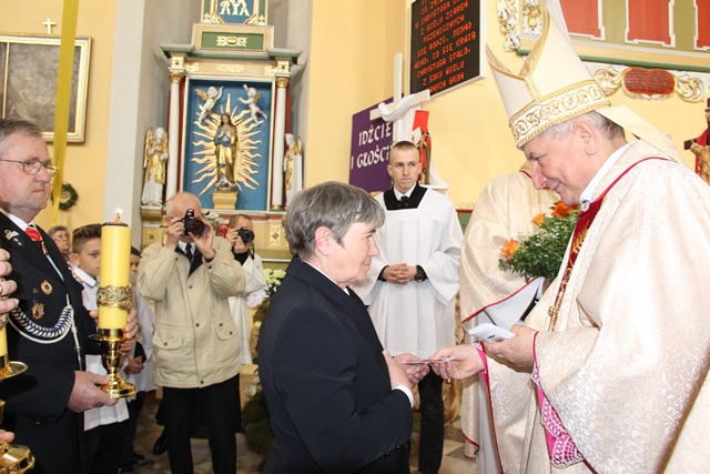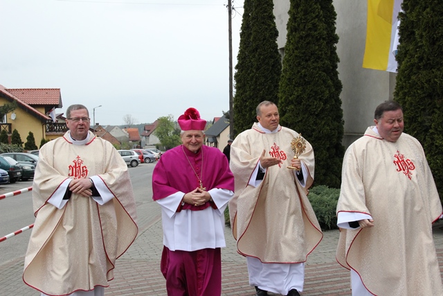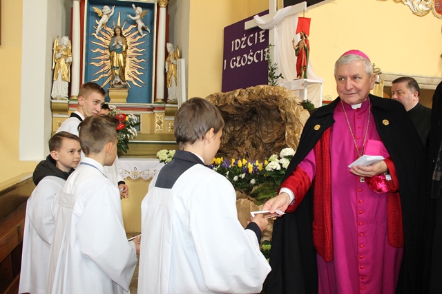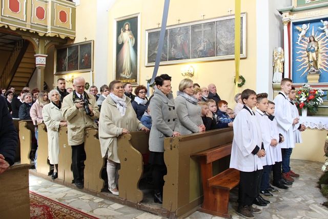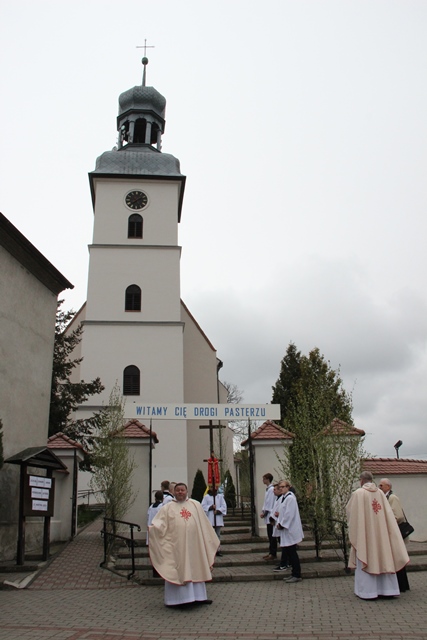Witając biskupa i wiernych ks. Waldemar Willak wskazał, że obecna murowana świątynia została wzniesiona w połowie XVII w. Dodał, że wyposażenie pochodzi z kościoła Świętego Krzyża na Ostrowskim Tumskim we Wrocławiu. Zaznaczył, że w ołtarzu bocznym znajduje się płaskorzeźba z 1499 r. autorstwa uczniów Wita Stwosza. Proboszcz podkreślił, że dzięki pozyskaniu środków unijnych świątynia została gruntownie wyremontowana. Poprosił biskupa kaliskiego o poświęcenie kamiennego ołtarza i ambony.