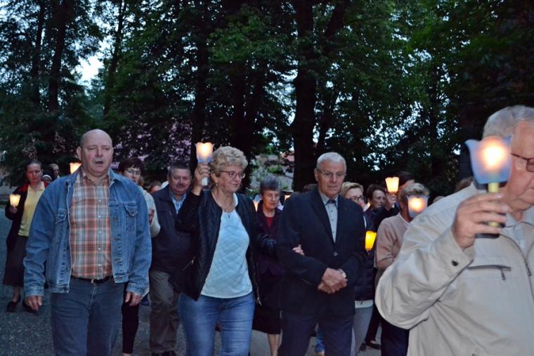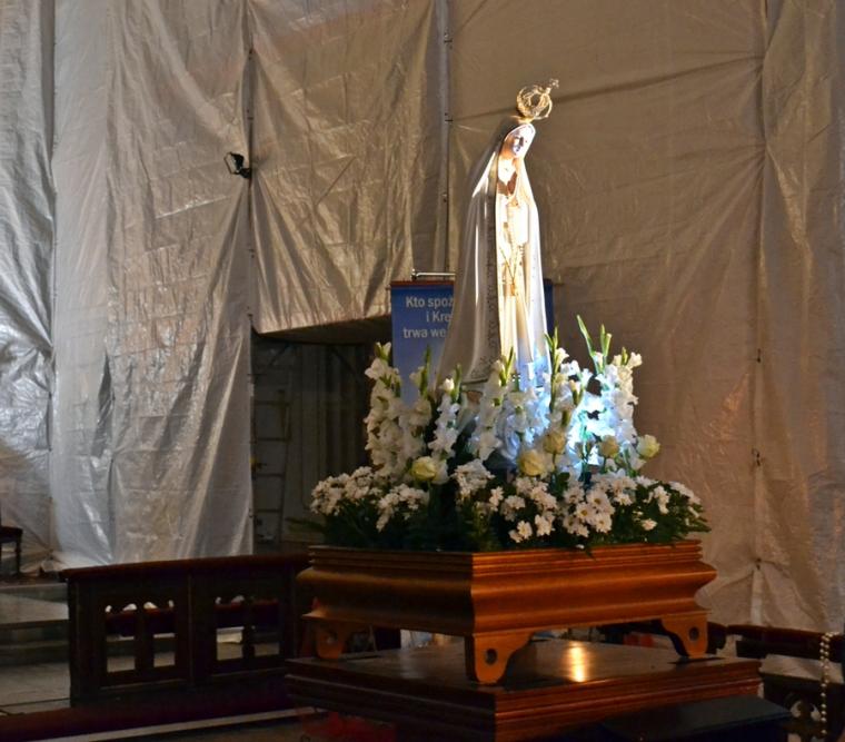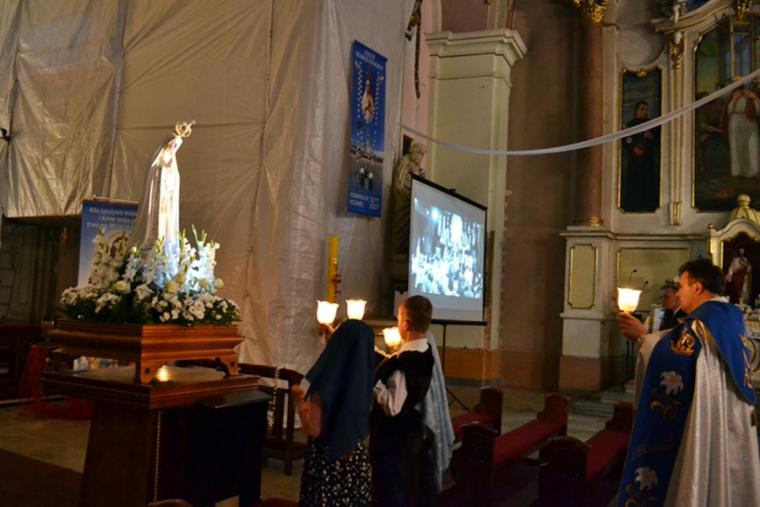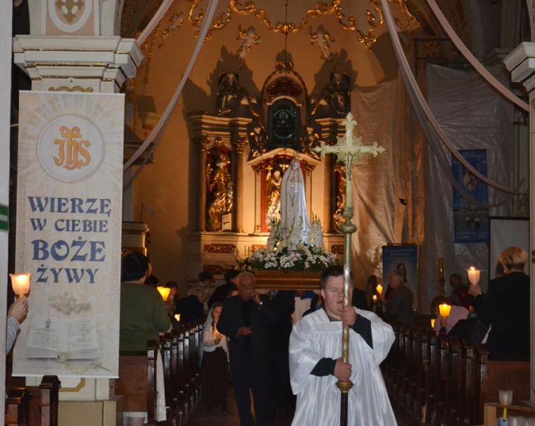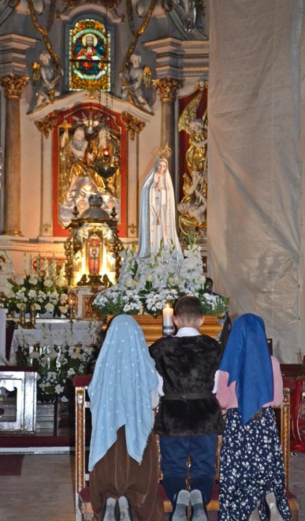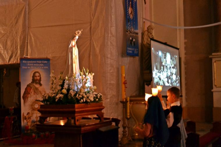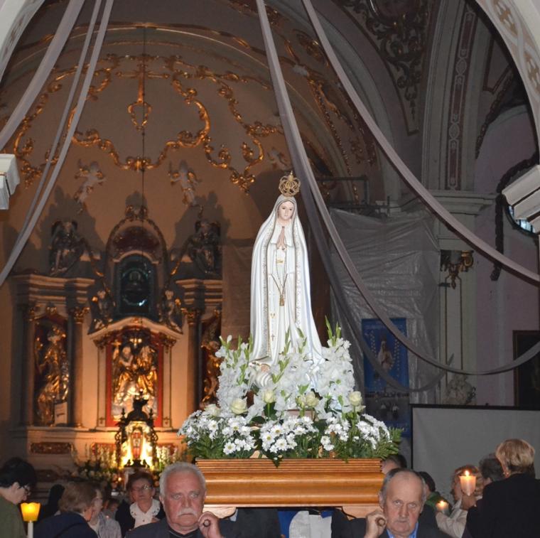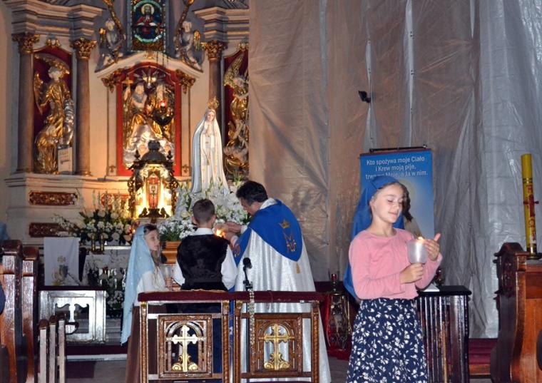 W rozważaniu poprzedzającym modlitwę różańcową ks. kan. Krzysztof przybliżył parafianom stan serc fatimskich pastuszków. Podkreślił, że byli oni posłuszni swoim rodzicom, pełni prostoty i czystości. Jak wskazał, to zapewne było powodem tego, że to właśnie im Maryja powierzyła misje zaniesienia światu swego przesłania. W dalszej części rozważania ks. kanonik przypomniał uczestnikom modlitewnego spotkania treść drugiego objawienia. Zaakcentował rolę i znaczenie ustanowienia nabożeństwa do Niepokalanego Serca Maryi. Podkreślając znaczenie wspólnoty i pracy nad sobą powiedział m.in. „ Nasza parafialna wspólnota ma również swoje serce. Ono bije w każdym z nas. Wciąż uczymy się jaką powinniśmy być wspólnotą. Zadania te wynikają z naszego chrztu. Ponieważ jednak nasza ludzka natura skłonna jest do grzechu, dlatego wciąż modlimy się , pracujemy nad sobą, aby nasze serca były podobne do Serca Pana Jezusa i Niepokalanego Serca Maryi”. Ks. kan. podkreślił, że w wielu miejscach, gdzie miały miejsce objawienia Matki Bożej gromadzą się tłumy wiernych, którzy chcą dotknąć tajemnicy Niepokalanego Serca Maryi. Kończąc rozważanie ks. kan. powiedział: „ My zgromadzeni na nabożeństwie fatimskim odmawiamy różaniec, śpiewamy pieśni maryjne, prosimy Maryję o wstawiennictwo u Trójjedynego Boga we wszystkich naszych potrzebach. Tym samym jesteśmy wspólnotą , której celem jest sam Bóg”. Po zakończeniu rozważania rozpoczęliśmy modlitwę różańcową. Przy pięknie przyozdobionej figurze Pani Fatimskiej nie mogło zabraknąć pastuszków. W ich postacie wcieliły się dzieci z naszej parafii. Ku niebu popłynęła modlitwa, o którą nieustannie prosiła i prosi Maryja… W kontemplowaniu tajemnic różańca pomocne były rozważania ks. kanonika. Przed rozpoczęciem czwartej tajemnicy ks. kan. od świecy płonącej przy figurze odpalił świece pastuszków. Ci zanieśli to światło do uczestników nabożeństwa. Po zakończonej modlitwie różańcowej wyruszyliśmy w procesji z figurą Fatimskiej Pani zapalonymi świecami wokoło kościoła. Podczas procesji rozległo się bicie dzwonów w mikstackiej świątyni. Wzywają nas one i przypominają codziennie od dnia nawiedzenia o Apelu Jasnogórskim. Gdy procesja powróciła do kościoła w duchowej łączności z Jasną Górą śpiewaliśmy: Maryjo jestem, pamiętam, czuwam! Po końcowym błogosławieństwie wierni otoczyli figurę Fatimskiej Pani i zaśpiewali pieśń „ Zapada zmrok…”. Wypowiedziane z życzliwością i uśmiechem słowa „ Dobrze, że jesteś” do osób stojących najbliżej nas uświadomiły nam, że naprawdę jesteśmy wspólnotą. I jeszcze jedna refleksja. Pięknie prezentowała się udekorowana kwiatami Fatimska Pani, ale co najważniejsze otoczona była sercami kochających Ją ludzi.