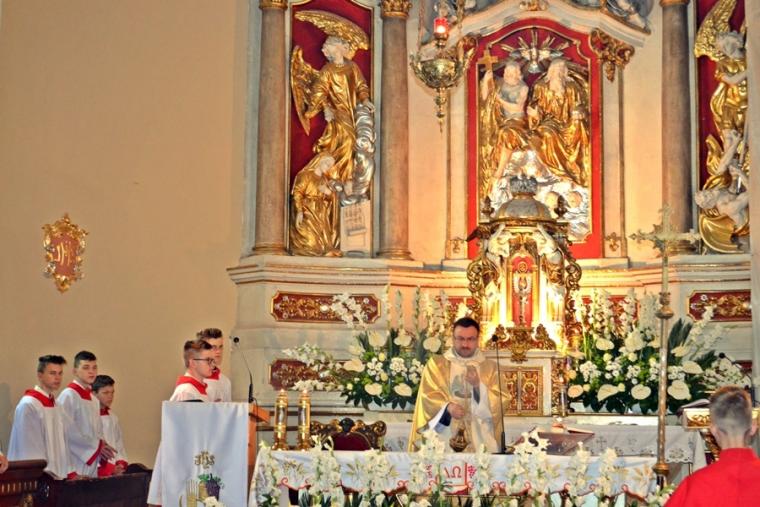 Kontynuując rozważanie ks. kan. podkreślił, że pierwszym celem liturgii jest uwielbienie Boga. Zwrócił także uwagę na zanik sacrum w życiu współczesnego człowieka, co prowadzi do tego, świat szybciej się sekularyzuje niż Kościół go ewangelizuje. Nawiązując do obchodzonego w tym roku 100- lecia objawień fatimskich ks. kan. Krzysztof powiedział: „…warto zatrzymać się nad treścią modlitwy anioła z Fatimy: „ O mój Boże, wierzę w Ciebie, uwielbiam Cię, kocham, Cię, ufam Tobie…”. W dalszej części kaznodzieja zwrócił uwagę na przywrócenie sacrum w dwóch wymiarach: doświadczenia wewnętrznego, ale także w wymiarze zewnętrznym czyli dotyczącym naszej postawy, gestów, staranności z jaką je wykonujemy. Kaznodzieja zachęcił zebranych do swoistego rachunku sumienia, do postawienia sobie osobiście pytania o to jak traktujemy Ciało Pańskie. Zapytał mi. in. o to czy przyklękamy przed tabernakulum, jak się zachowujemy, jaka przyjmujemy postawę mijając kapłana idącego z Najświętszym Sakramentem do chorych. Kontynuując pytał: Klęczysz czy kucasz? Gdzie w Piśmie Świętym jest napisane kucnij przed Panem”. Przywołał słowa św. Pawła mówiące „ Na imię Jezusa zegnie się każde kolano istot niebieskich i ziemskich i podziemnych”. Kaznodzieja zwrócił uwagę, że już podczas procesji eucharystycznej możemy zmienić swoją postawę i zgiąć kolana przed wychodzącym na nasze ulice Panem. Wiele ważnych słów padło w tej homilii. Trzeba mieć nadzieje, że pobudziły one uczestniczących w uroczystej sumie wiernych do refleksji, a w konsekwencji do podjęcia kroków mających na celu przywrócenia sacrum w naszym życiu.