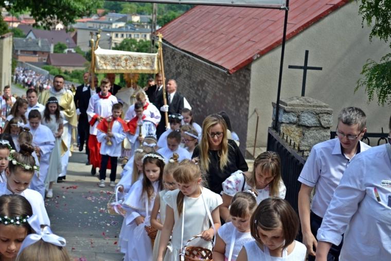 Po Mszy Świętej przed wystawionym Najświętszym Sakramentem, odmówiliśmy Litanię do Serca Jezusowego. Następnie wraz z Jezusem ukrytym pod postacią Chleba wyruszyliśmy w procesji do czterech ołtarzu. Krzyż, chorągwie, feretrony, poduszki z emblematami religijnymi niesione przez dzieci poprzedzały w procesji Jezusa ukrytego pod postacią Chleba niesionego w monstrancji. Tuż przed kapłanem niosącym monstrancje szły dziewczynki sypiące kwiatki. Pięknie przygotowane zostały ołtarze.