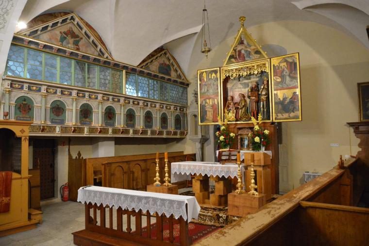 Po zamknięciu skrzydeł bocznych przed oczami modlących jawią się dwie postaci naturalnej wielkości namalowane na desce: Matka Boża Bolesna i Jezus ubiczowany. Zwieńczeniem górnej części ołtarza jest scena pasyjna – Maryja trzyma na rękach ciało umęczonego Syna (pieta). Na uwagę zasługuje też piękna ambona z wizerunkami ewangelistów.