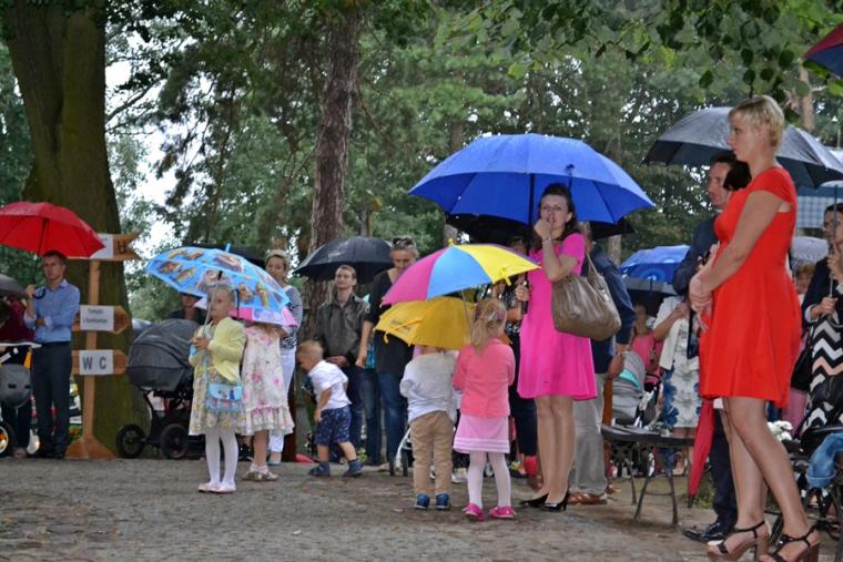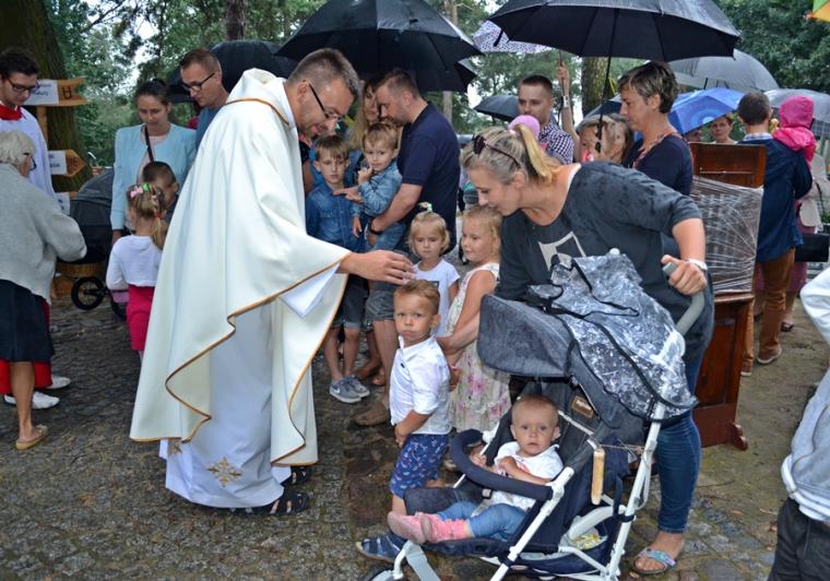Czas wielkiego świętowania rozpoczął się procesją z Najświętszym Sakramentem i relikwiami Świętego Rocha z kościoła farnego do sanktuarium, zakończył jej powrotem. Zanim procesja z Najświętszym Sakramentem wyruszyła z sanktuarium do fary wyjątkowo gwarno zrobiło się wokół niego. W dniu uroczystości odpustowych przybyły wraz ze swoimi rodzicami do św. Rocha dzieci. Tu o godz. 18:00 ks. kan. Bogumił Kempa sprawował w ich intencji Mszę święta oraz skierował do wiernych rozważanie. Krótko po rozpoczęciu Eucharystii zaczął padać deszcz. Ksiądz Bogumił zaprosił dzieci, by zgromadziły się przy ołtarzu, bo zostało nad nim przygotowane zadaszenie. Na początku homilii kaznodzieja powiedział, że pierwszy raz głosi ją w takim towarzystwie. Wyraził radość z obecności tak wielu dzieci w sanktuarium u św. Rocha. Podkreślił, że dzieci przybyły tu po błogosławieństwo, które czyni człowieka szczęśliwym. Wyjaśniając istotę błogosławieństwa powiedział: „ Jeżeli błogosławię, to znaczy życzę komuś dobrze, życzę mu szczęścia. Przyszły tutaj te dzieci, aby mogły dostać Boże szczęście, dlatego tak ważna drodzy rodzice jest wasza obecność tutaj”. O tym jak ważne jest to, by rodzice błogosławili swoje dzieci mówił kaznodzieja w dalszej części rozważania. Zachęcał, by rodzice jak najczęściej błogosławili swoje dzieci. Dając świadectwo powiedział, że jego rodzice nadal błogosławią go, gdy wraca do domu, bądź z niego wyjeżdża. Stwierdził, że ważne jest to błogosławieństwo, bo uświadamia nam, że tylko Chrystus może dać nam prawdziwe szczęście. Nawiązując do postaci św. Rocha powiedział: „ Ten nasz wspaniały Patron, którego czcimy już od tylu dni jest tego dowodem. Ten człowiek doświadczył i cierpienia i złośliwości, doświadczył uwięzienia, doświadczył choroby. Doświadczył tego, że tak wielu ludzi się od niego odwróciło. A jednak jest błogosławiony, jest szczęśliwy”. W dalszej części rozważania ks. Bogumił zachęcał i prosił rodziców,aby uczestniczyli z dziećmi we Mszy św. i pokazywali im jak jest ona ważna. Podkreślił ponadto znaczenie przykładu rodziców i zachęcał, by klękali do modlitwy i uczyli jej swoje dzieci. Kończąc homilię kaznodzieja powiedział: „ Niech Boże błogosławieństwo z tego miejsca, z tego sanktuarium spływa na was, na wasze rodziny, na wszystkie dzieci, także na te nienarodzone, bo widzę że i takie też tu są. Niech Pan Bóg wam wszystkim błogosławi”. Została odmówiona specjalna modlitwa, a następnie kapłani udzielali dzieciom indywidualnego błogosławieństwa. Na pamiątkę spotkania u św. Rocha dzieci otrzymały obrazki. Były też i dla nich słodycze.