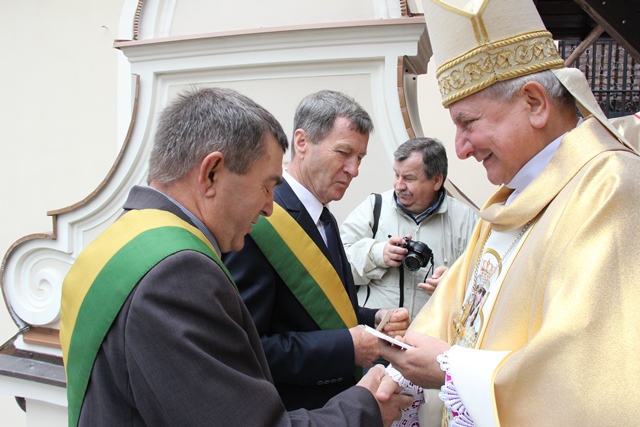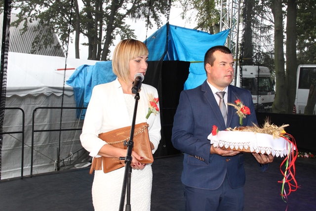Po Eucharystii starostowie dożynek Beata Budzik z Boczkowa i Sławomir Wawrzyńczak ze Skalmierzyc złożyli bochen chleba na ręce biskupa kaliskiego Edwarda Janiaka, burmistrz Nowych Skalmierzyc Bożeny Budzik i przewodniczącego rady miasta i gminy Nowe Skalmierzyce Kazimierza Sipki.