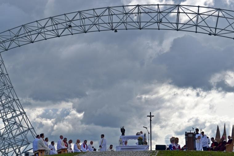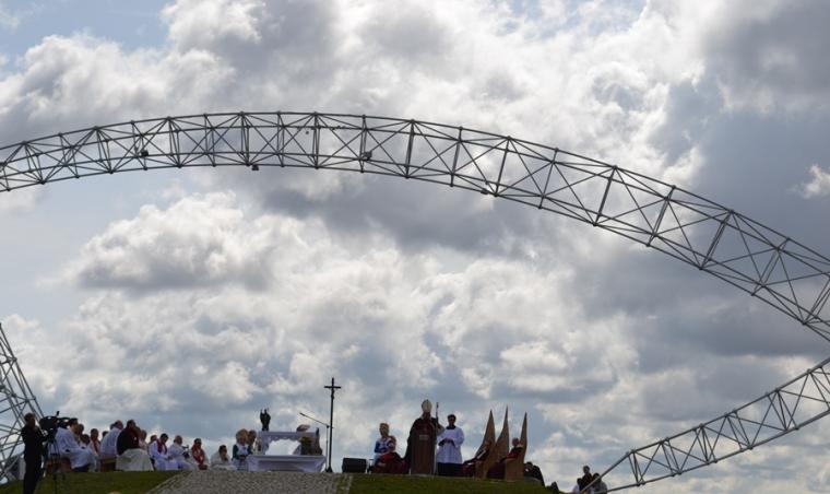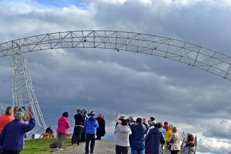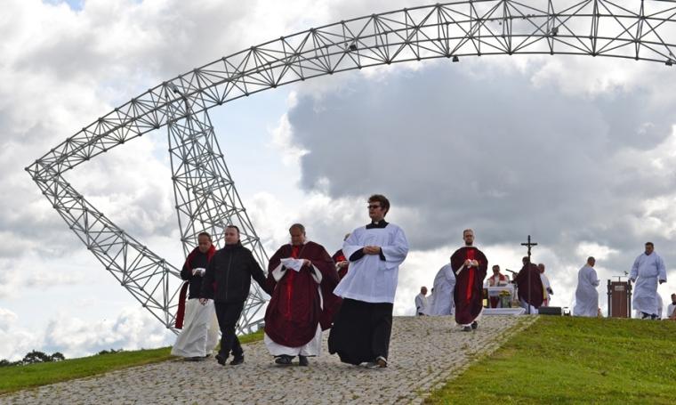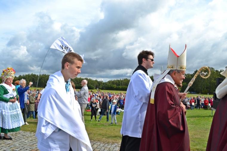 O godz. 12:45 rozpoczęła się Eucharystia, której przewodniczył ks. bp Michał Janocha, który także wygłosił homilię. Podkreślił w niej, że poprzez chrzest staliśmy się ludźmi wolnymi. Nawiązując do symboliki wagi, że gdy jej szale znajdują się na jednakowym poziomie wszystko w życiu może się wydarzyć. Od decyzji człowieka, od jego wyborów zależy w którą stronę przechyla się jej szale. Ks. biskup podkreślił, że człowiek stawiany jest nieustannie w sytuacjach wyboru miedzy prawdziwym dobrem, dobrem pozornym, które często podawane jest człowiekowi w pięknym opakowaniu. W dalszej części homilii ks. bp rozważał znaczenie trzech słów: rozwaga, uwaga, odwaga, podkreślając ich znaczenie w kontekście rozwoju duchowego człowieka. Ks. Biskup podkreślił, że człowiek współczesny ma wiele problemów ze skupieniem uwagi na tym, Który jest w życiu najważniejszy. Przywołał przykład Matki Teresy z Kalkuty, która potrafiła skoncentrować swoją uwagę na tym co działo się w jej życiu w konkretnym momencie. Podkreślił, że na tym właśnie polega „ tajemnica świętości”. Ks. biskup zachęcał zebranych, rozwagę, uwagę i odwagę prosili Matkę Bożą. Po Eucharystii był czas na posiłek i chwilę odpoczynku. W godzinie miłosierdzia odśpiewana została Koronka do Miłosierdzia Bożego. W popołudniowej części spotkania Lednicy Seniora uczestniczył Prymas Polski abp Wojciech Polak. Podczas odprawiania Koronki młodzież wniosła obraz Jezusa Miłosiernego. Następnie zostały zaprezentowane dwie inscenizacje biblijne: „Rola Maryi – Maryja wyprowadza nas z ukrycia” oraz „Ty jesteś Zacheuszem – Pragnij i zaryzykuj”. Siostry zakonne w geście rozesłania wykonując na czole uczestników spotkania znak krzyż wypowiadały słowa: Idź i kochaj. Podczas modlitewnego spotkania pod Bramę III Tysiąclecia została przyniesiona figura Matki Bożej Fatimskiej, obraz Czarnej Madonny oraz pusta rama. Podczas wprowadzania figury i obrazu ku niebu popłynęła modlitwa różańcowa. Na Legnickie Pola przybyli także przedstawiciele Wspólnoty Betlejem. Złożone przez nich świadectwa nawrócenia i spotkania z Jezusem zrobiły na zebranych wielki wrażenie.