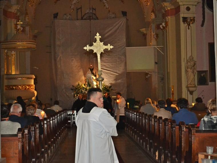 Kolejne postanowienia dotyczyły codziennej modlitwy do Ducha Świętego, a także obrania Maryi za Królową naszych serc. Podczas odmawiania piątej tajemnicy w świątyni zapłonęły lampiony przyniesione przez wiernych. Zostały one zapalone od świecy jubileuszowej stojącej przy figurze Fatimskiej Pani. Następnie odmówiliśmy modlitwę Anioła i ze śpiewem na ustach z zapalonymi lampionami wyruszyliśmy figurą Fatimskiej Pani z procesją wokoło kościoła. W tym czasie rozległ się dźwięk dzwonów, który przypomina nam o tym, by stanąć do Apelu Jasnogórskiego. Towarzyszy nam on od czasu nawiedzenia naszej parafii przez Czarną Madonnę w 2011 roku. Po powrocie do kościoła został odśpiewany Apel Jasnogórski . Maryjo: jesteśmy, pamiętamy, czuwamy- to wyznanie popłynęło ku niebu z naszego parafialnego wieczernika. Modlitwą w ten wieczór objęliśmy także zgromadzonych w polskiej Fatimie na zakopiańskich Krzeptówkach Kustoszy Sanktuariów i uczestników Międzynarodowego Kongresu Maryjno- Mariologicznego.