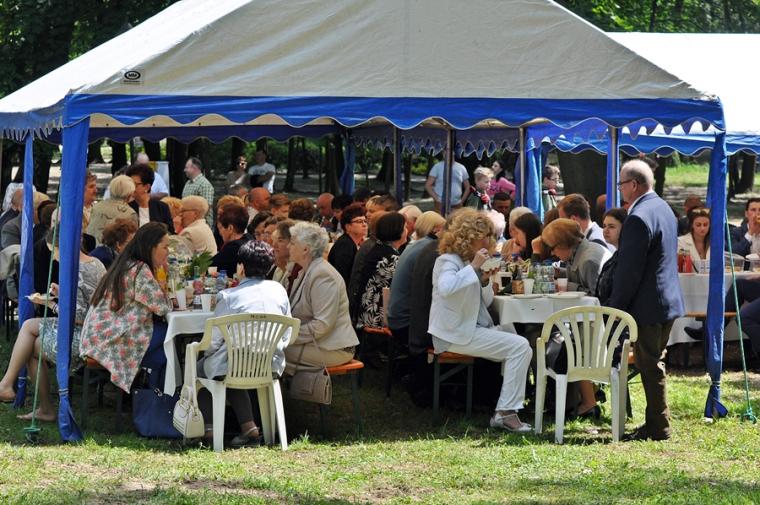 Po dziękczynieniu Panu Bogu nadszedł czas na radosne spotkanie w Parku Świętego Rocha. Dlaczego tam? Wielkim pragnieniem księdza Jubilata było spotkanie się przy stole ze wszystkimi uczestnikami dziękczynnej Eucharystii. Żadna sala nie byłaby w stanie pomieścić wszystkich tych, którzy w tym wyjątkowym dniu ofiarowali ks. Jubilatowi najcenniejszy dar – modlitwę.