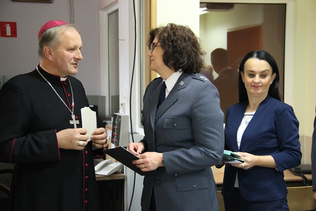 Wizytę w areszcie śledczym rozpoczęło spotkanie z pracownikami. Gości powitał dyrektor kpt. Waldemar Zaremba. Po odczytaniu Ewangelii o Bożym Narodzeniu przez kapelana więziennego ks. Pawła Wczesnego słowo do pracowników aresztu skierował bp Łukasz Buzun. – Państwa zawód nie należy do łatwych. Jeśli wybieramy taką drogę życiową to Pan Bóg daje łaskę i wspiera, abyśmy wykonywali swoje posłannictwo jak najlepiej. Życzę, aby te święta Bożego Narodzenia były świętami rodzinnymi, niosły ze sobą ciepło i światło. Życzę radości w sercu i siły do wykonywania tej posługi – mówił biskup.