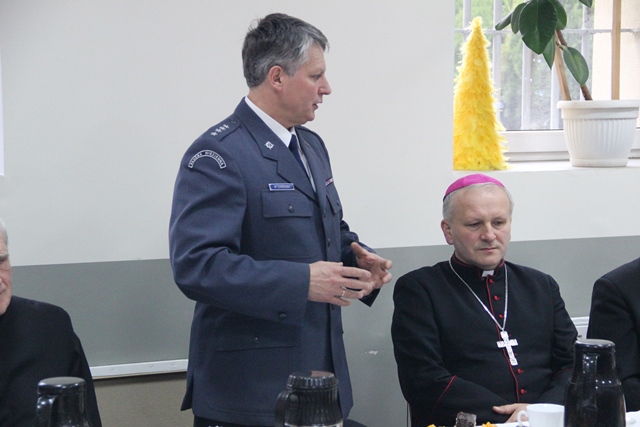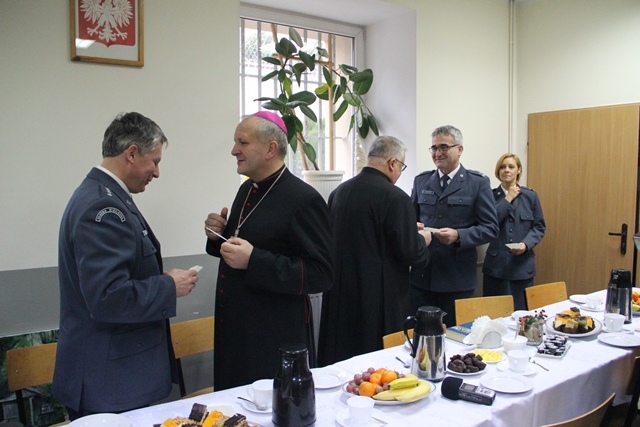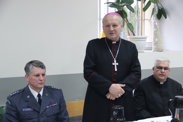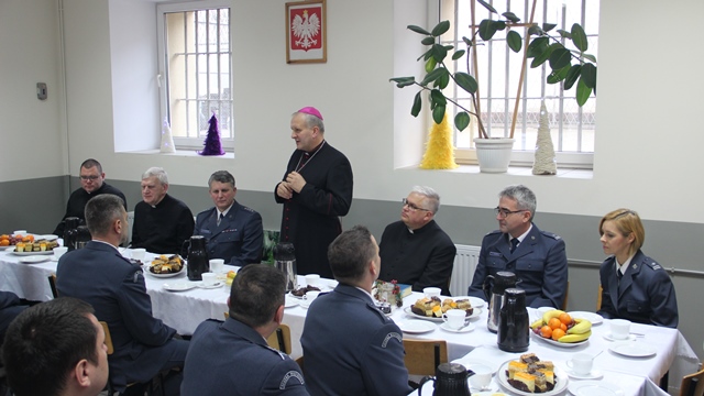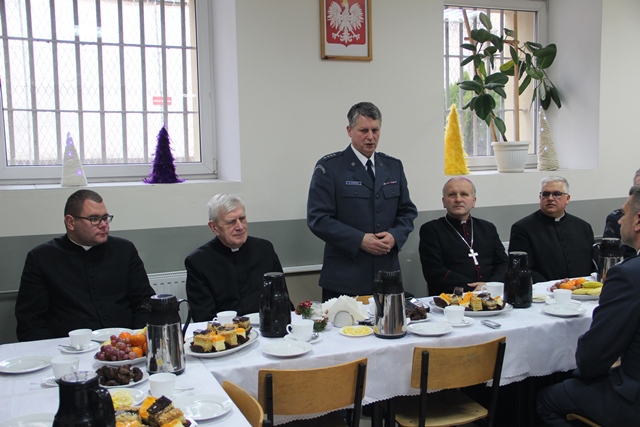Wizytę w Areszcie Śledczym rozpoczęło spotkanie z pracownikami. Gości powitał dyrektor kpt. Waldemar Zaremba. Po odczytaniu Ewangelii o Bożym Narodzeniu przez ks. kan. Krzysztofa Nojmana, proboszcza konkatedry, słowo do pracowników aresztu skierował bp Łukasz Buzun, który przypomniał, że 6 stycznia kończy się obchodzony w diecezji kaliskiej Nadzwyczajny Rok Świętego Józefa Kaliskiego. - Chciałbym, aby św. Józef, który jest patronem diecezji był opiekunem tego miejsca i każdego z was. Św. Józef to człowiek szczery, prosty, otwarty, zdecydowany w swoim działaniu, słuchający głosu Bożego. Życzę, aby te święta wnosiły dużo pokoju w serca i by ten dobry klimat świąteczny był przekazywany w środowisku pracy – mówił duchowny.