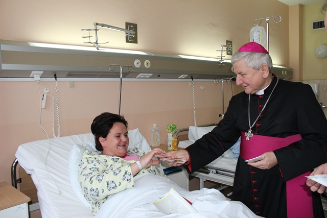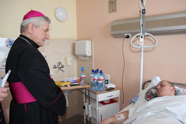 Biskup odwiedził pacjentów oddziału chirurgii ogólnej i przewodu pokarmowego, a pozostali kapłani przełamali się opłatkiem z chorymi leżącymi na wszystkich oddziałach kaliskiego szpitala.