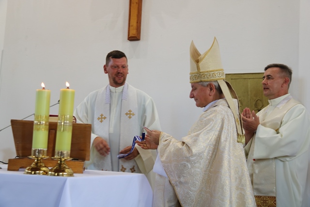Z rąk przewodnika 279. Wieruszowskiej Pieszej Pielgrzymi biskup otrzymał legitymację z nr 1 „Przyjaciel Pielgrzymki”.