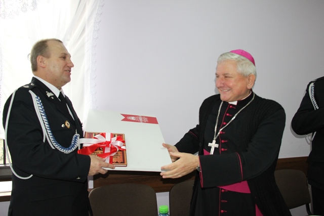Biskupowi kaliskiemu Edwardowi Janiakowi podziękował za przewodniczenie w ubiegłym roku Mszy św. z okazji wielkopolskich wojewódzkich obchodów Dnia Strażaka w Krotoszynie i poświęcenie 41 nowych wozów strażackich, a także za życzliwość okazywaną strażakom.