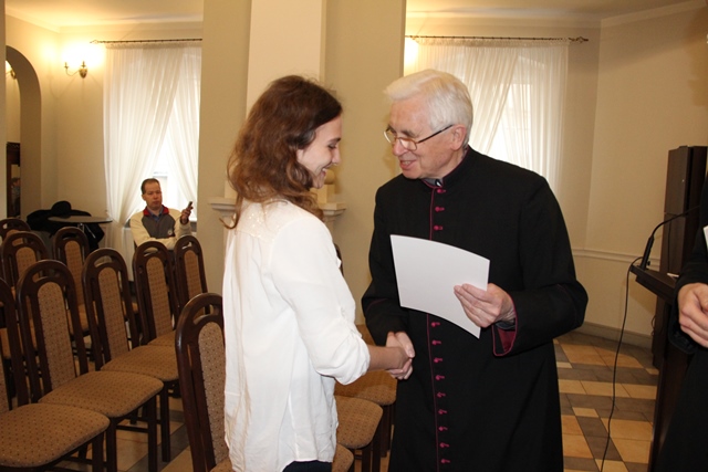 Laureaci odebrali dyplomy i nagrody z rąk ks. prałata Jerzego Adamczaka, wikariusza biskupiego ds. katechizacji. Książki i dyplomy przygotowano dla wszystkich uczestników. Fundatorami nagród byli: Biskup Kaliski Edward Janiak, Wydawnictwo św. Wojciecha w Poznaniu, Wydawnictwo Jedność w Kielcach, Wydawnictwo Gaudium w Lublinie i Wydział Katechetyczny Kurii Diecezjalnej w Kaliszu. - Wiedza chociaż jest bardzo ważna także dla uzasadnienia swoich postaw religijnych nie wystarczy, bo trzeba być człowiekiem wierzącym, a wiarę uzyskuje się poprzez kontakt z Panem Jezusem. Chcąc być rzeczywiście człowiekiem religijnym trzeba mieć wiedzę, ale przede wszystkim trzeba nauczyć się być w kontakcie z Bogiem i tego Wam wszystkim życzę – mówił ks. prałat Jerzy Adamczak.