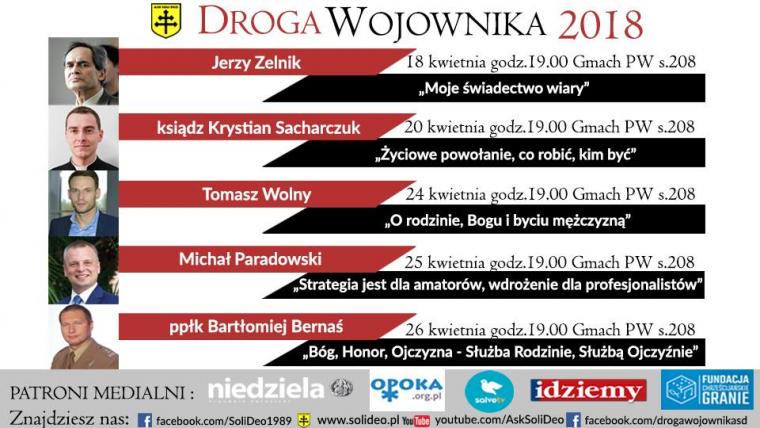Cykl konferencji Droga Wojownika odbędzie się w dniach 18-26 kwietnia w Warszawie. W tym roku mamy zaszczyt gościć aż pięciu prelegentów, którzy przekażą nam wiele cennych wskazówek jak postępować w życiu aby być prawdziwym mężczyzną. Jeśli jesteś zmotywowany i chętny budować w sobie mężczyznę, wojownika, być teraz lub w przyszłości lepszym mężem, ojcem, człowiekiem, przyjdź wysłuchać cennych wskazówek naszych prelegentów, to nic nie kosztuje a na pewno zaowocuje dobrem!