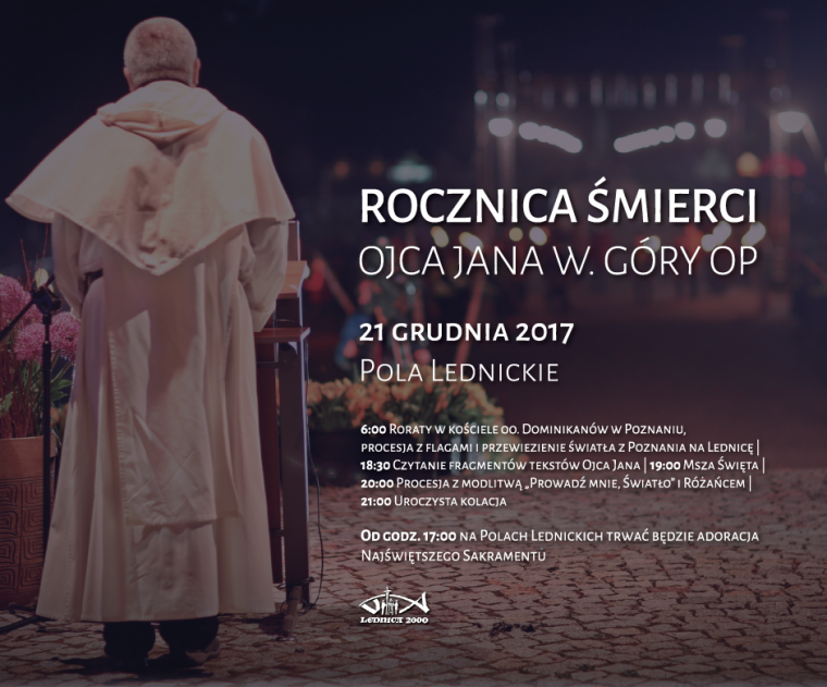 21 grudnia 2017 r. zapraszamy do spotkania na Polach Lednickich, które przebiegnie pod hasłem „Prowadź mnie, Światło!”. Słowa te rozpoczynają ukochaną modlitwę o. Jana, którą tak często powtarzał. Chcemy tym samym podziękować za Światło, które Duch Święty objawił, w tak bliskiej naszym sercom osobie o. Jana. Chcemy podziękować, za każde usłyszane „Kocham Was” i za każde „Czekam na Was”. Chcemy po prostu być razem.