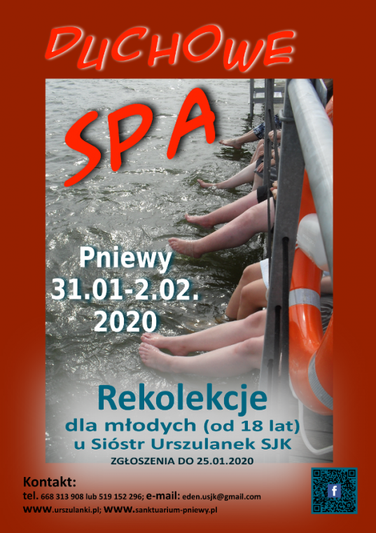Otwieramy je dla Ciebie w naszym urszulańskim klasztorze, w samym środku zimy, aby było Ci cieplej i lżej. Wszystkie reklamy mówią, że SPA to idealne miejsce dla piękna, urody i relaksu. Nasza reklama dodaje, że duchowe SPA jest odpowiedzią na potrzeby naszych drogich Przyjaciół i że pomoże Ci przywrócić równowagę wewnętrzną, poddać się leczącym dłoniom Boga i spojrzeć w przyszłość z nową nadzieją.