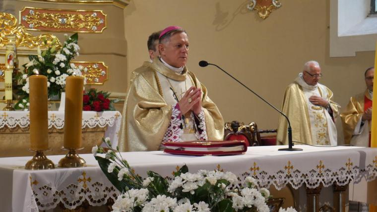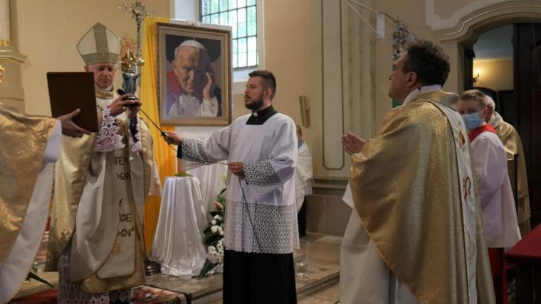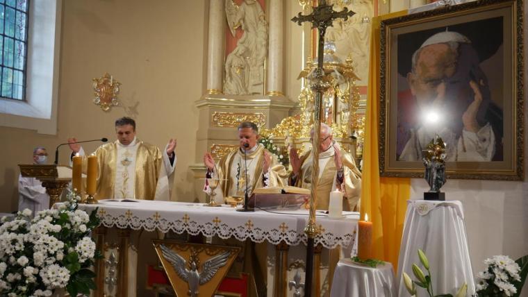 13 czerwca odbyła się w Mikstacie uroczystość przekazania przez Abpa Mieczysława Mokrzyckiego, wieloletniego osobistego sekretarza dwóch papieży, relikwii św. Jana Pawła II. Przekazując relikwie ks. proboszczowi Krzysztofowi Ordziniakowi ks. Abp powiedział: „Księże proboszczu, przyjmij tę relikwię i otaczaj ją należytą czcią i przekazuj do czczenia wiernym. Niech wszyscy modlący się przed tymi relikwiami za wstawiennictwem św. Jana Pawła II otrzymują obfitość łask i niech Go naśladują w wierze i miłości”. Następnie słowa powitania zostały wypowiedziane przez przedstawicieli parafian. Ks. proboszcz przypomniał inicjatywy podjęte w parafii, które doprowadziły do tej radosnej chwili przekazania relikwii. Podkreślił, że w znaku relikwii chcemy uczcić i powitać św. Jana Pawła II jako opiekuna i orędownika, ale także pogłębić więź modlitewną, przekazać dziedzictwo, które nam pozostawił kolejnym pokoleniom. Zwracając się do Ks. Abp Mieczysława Mokrzyckiego ks. proboszcz zaakcentował, że przybywa z dalekiego Lwowa, aby przekazać nam relikwie św. Jana Pawła II oraz wzmocnić naszą wiarę świadectwem swego życia. Następnie ks. kan. Krzysztof skierował słowa powitania do wszystkich uczestników uroczystości, dziękując tym, którzy przyczynili się do tego, że mogła się ona odbyć. Ks. proboszcz poprosił Hierarchę o przewodniczenie Eucharystii i sprawowanie jej w intencji wszystkich parafian.