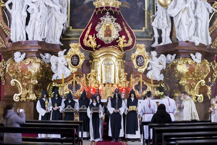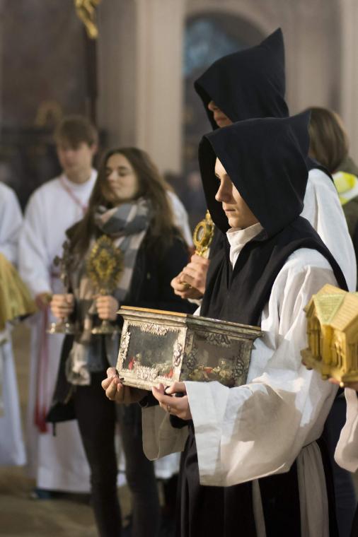 Kolejnym punktem krzeszowskiej Nocy Wszystkich Świętych była procesja z relikwiami, które spoczęły w Mauzoleum Piastów. Część uczestników procesji przebrana była za mnichów, którzy kiedyś przemierzali korytarze i zakamarki krzeszowskiego opactwa. W procesji niesiono relikwie św. Tomasza, św. Szymona, św. Judy Tadeusza, św. Bartłomieja i Jakuba Mniejszego, św. Innocentego czy św. Scholastyki. Relikwiarze spoczęły pod obrazem Wszystkich Świętych i św. Jadwigi Śląskiej. Tam, w towarzystwie świętych, można było spędzić czas na modlitwie lub wziąć udział w grze terenowej.