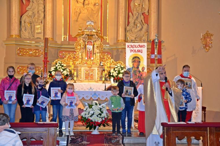 Do tej pory Rochowe Szesnastki odbywały się on-line.  16. maja udało nam się spotkać w naszym parafialnym kościele. Majowa Rochowa Szesnastka połączona została z Eucharystią. Odbyło się podczas niej także podsumowanie zadań, które mieli do wykonania uczestnicy spotkań w ostatnich miesiącach. Eucharystii przewodniczył ks. kan. Krzysztof Ordziniak, kustosz Diecezjalnego Sanktuarium św. Rocha.  Na początku homilii opowiedział dzieciom o chłopcu, który pisał testament i jego siostrze. Rafał, bo tak miał na imię chłopiec, wszystko co dobre chciał zostawić sobie, to z czego nie był dumny ( oceny z matematyki) chciał zapisać w testamencie swojej siostrze. Opowiadanie to stało się punktem wyjścia do rozmowy z dziećmi o tym, czym jest testament i co można w nim pozostawić. Ks. kan. Krzysztof  nawiązał do obchodzonej uroczystości wniebowstąpienia. Podkreślił, że Pan Jezus przed wstąpieniem do nieba polecił apostołom, by szli i nauczali, głosili dobrą nowinę. Jednocześnie zaakcentował, że wobec każdego ochrzczonego Bóg ma plan. Miał i wobec naszego patrona św. Rocha, którego życie poznajemy. Przypomniał zebranym kilka ważnych momentów z życia św. Rocha. Zaznaczył, że podczas choroby Rochowi chleb przynosił pies. Wykorzystał ten moment, by zapytać dzieci, co się dzieje w Mikstacie podczas uroczystości odpustowych. Bez problemu uzyskał  od uczestników Rochowych  Szesnastek  odpowiedź, że święci ( błogosławi się zwierzęta). Wyjaśnił dzieciom, że obrzęd ten odbywa się w Mikstacie od ponad trzystu lat. Dodał, że tradycje odpustowe, zwyczaje zostały nam przekazane  przez naszych przodków, należy  je poznawać, dbać o to, by przekazać je kolejnym pokoleniom. Podczas jednego ze spotkań, kiedy omawialiśmy zagadnienia związane z  tradycjami  odpustowymi, jeden z chłopców  napisał, że są one naszym dziedzictwem, skarbem, o który powinniśmy, jako dziedzice się troszczyć. Ksiądz kustosz podkreślił, jak ważną rolę mają w tym zakresie do odegrania właśnie dzieci. Zaznaczył, że w poznawaniu tradycji odpustowych, postaci św. Rocha pomagać im mają Rochowe Szesnastki. Zachęcał dzieci do przyłączenia się do naszej grupy, bo sporo się w niej dzieje.