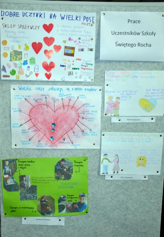 I tak, marcowa Rochowa Szesnastka wpisała się w okres Wielkiego Postu została przygotowana prezentacja o krzyżu w życiu Świętego Rocha. Podkreślono w niej, że Roch urodził się ze znamieniem krzyża na piersiach, ale także jego życie naznaczone było trudnymi doświadczeniami. Dzieci miały za zadanie wykonanie krzyży, które potem znalazły się nieopodal Grobu Pańskiego. Podczas kolejnej Rochowej Szesnastki dla dzieci została przygotowana prezentacja o obecności Matki Bożej w życiu patrona. Pozwoliła ona poznać dzieciom kolejne etapy życia Rocha. Dzieci w ramach zadań przygotowały domowe kapliczki oraz prace plastyczne na temat: Kapliczki i krzyże przydrożne naszej parafii. W czasie Wielkiego Postu wyruszyliśmy na poszukiwanie wzorów świętości. Gdy poznawaliśmy postać  Antonietty dzieci pisały listy do Pana Jezusa. Ciekawym zadaniem dodatkowym, które wykonała część dzieci było narysowanie portretu Maryi. Należy podkreślić, że dzieci z wielkim zaangażowaniem wykonywały poszczególne prace. Wszystkie są piękne, bo w ich wykonanie włożone zostało dziecięce serce.