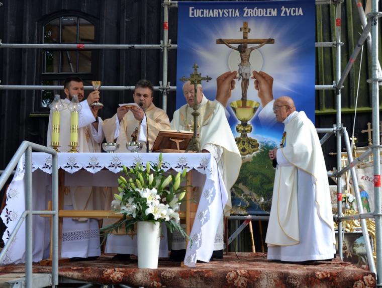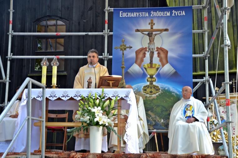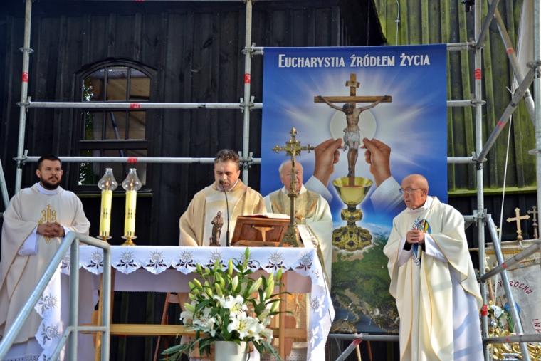 Msza Święta koncelebrowana rozpoczęła się przy ołtarzu polowym przy sanktuarium o godz. 18:30. Przewodniczył jej ks. proboszcz Krzysztof Ordziniak. Wraz z nim przy ołtarzu stanęli ks. kan. Andrzej Grabański, ks. kan. Grzegorz Ignor i ks. wikariusz Marcin Walczak. Rozpoczynając Eucharystię ks. kan. Krzysztof zaznaczył, że w Najświętszej Eucharystii zawiera się całe dobro duchowe Kościoła. Sprawia to, że człowiek wierzący pragnie spotykać się ze swoim Panem. Zaakcentował, że dobrze, że tradycją jest, że zakończenie oktawy Bożego Ciała odbywa się przy sanktuarium św. Rocha, wśród grobów naszych bliskich. Mamy okazję wyrazić im wdzięczność modlitewną za przekazany dar wiary. Jednocześnie zachęcał zebranych na Mikstackim Wzgórzu, by postawili sobie pytanie: Co ja przekazuję następnemu pokoleniu?