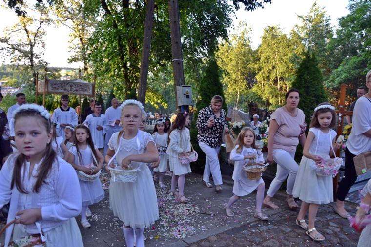 Po Eucharystii procesja wyruszyła do czterech ołtarzy, które usytuowane były na cmentarzu. Procesja przechodziła wśród grobów naszych przodków. To im zawdzięczmy naszą wiarę, ale także tradycje, które z tak wielką pieczołowitością pielęgnuje się w naszej wspólnocie i przekazuje kolejnym pokoleniom. Tak jak to już jest tradycją ołtarze przygotowali przedstawiciele poszczególnych rejonów naszej parafii. Pięknie prezentowały się ołtarze, ale Jezus znalazł także przygotowane miejsce w sercach parafian, którzy tak licznie w czasie Mszy Świętej przystąpili do Stołu Pańskiego.