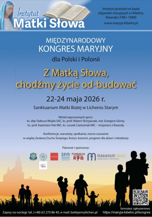 Instytut Matki Słowa zaprasza na Międzynarodowy Kongres Maryjny, który odbędzie się w dniach 22–24 maja 2026 r. w Licheniu. Tegoroczne spotkanie będzie przebiegało pod hasłem: „Z Matką Słowa chodźmy życie OD-BUDOWAĆ”. Kongres jest skierowany zarówno do uczestników z Polski, jak i do Polonii rozsianej po świecie. Serdecznie zapraszamy!
