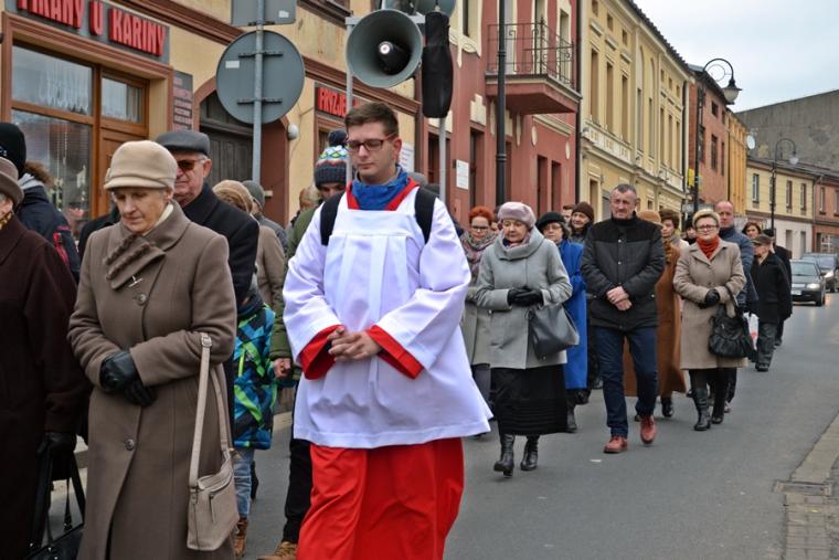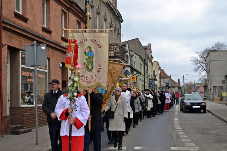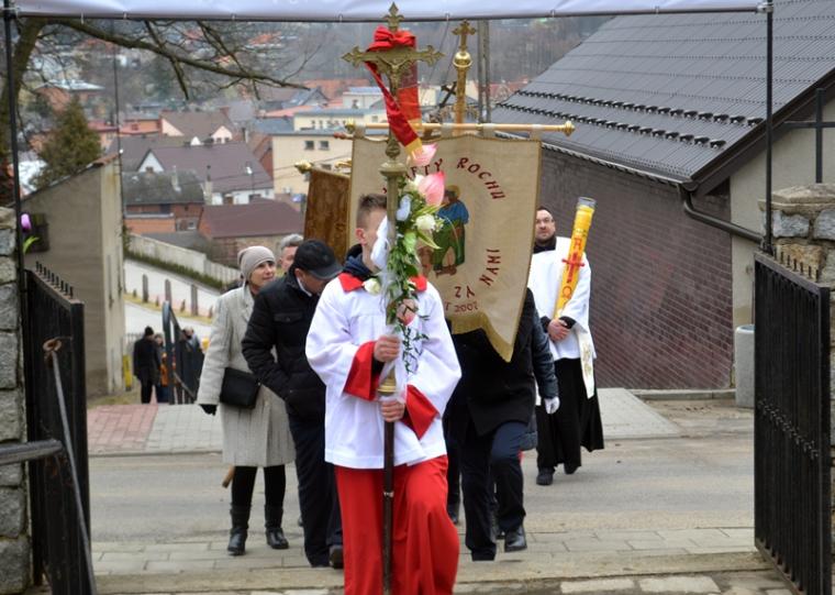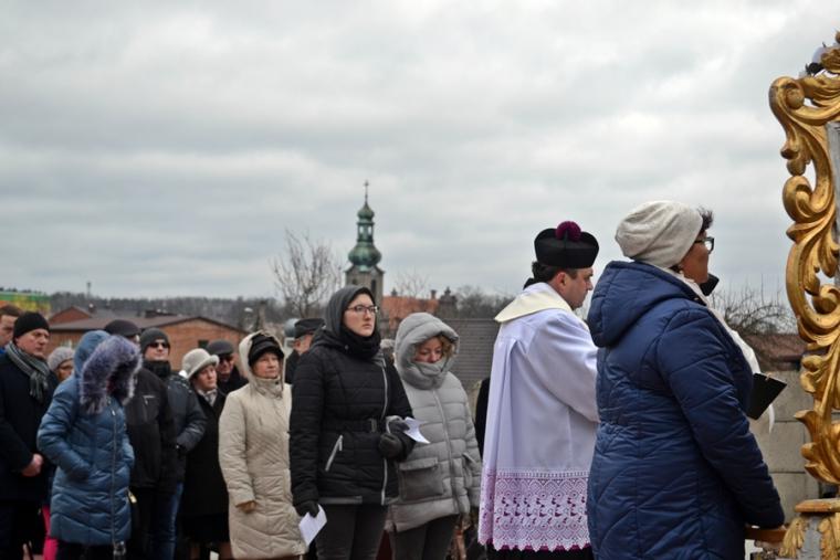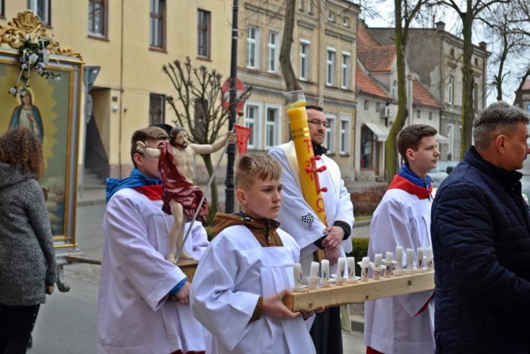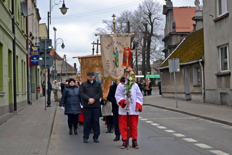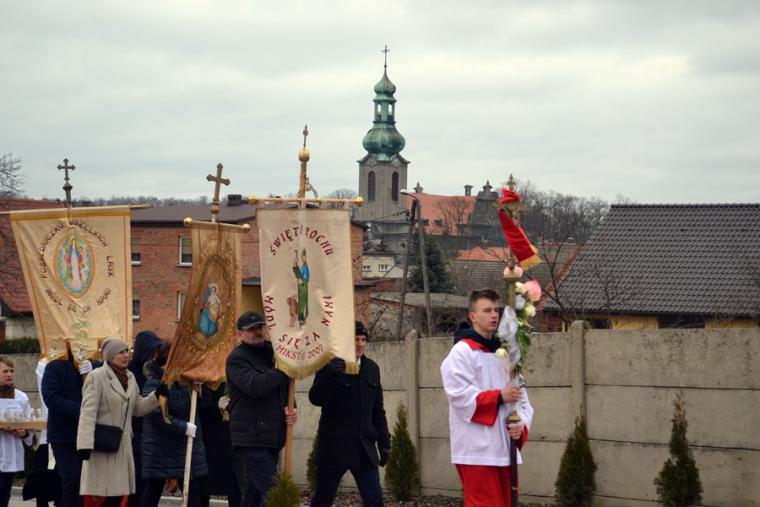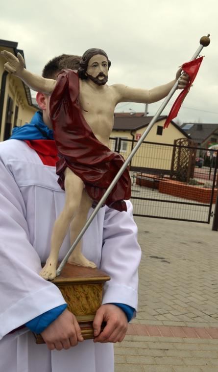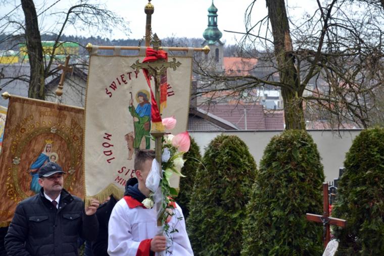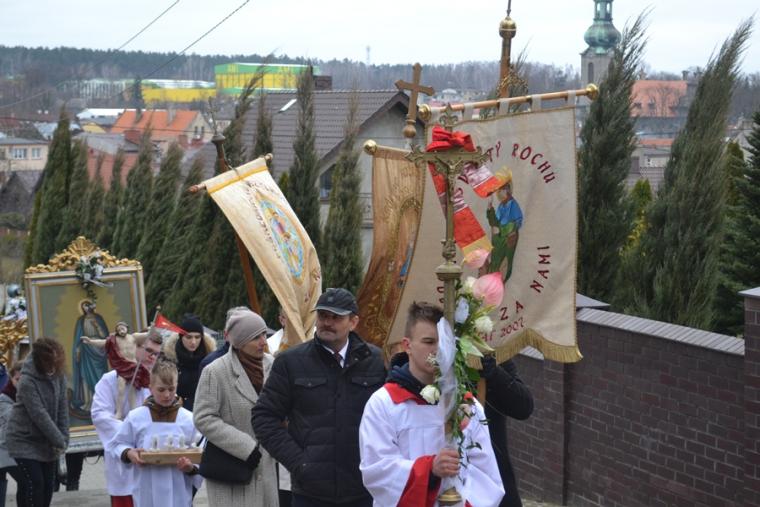 Po odprawieniu Nowenny do Miłosierdzia Bożego z krzyżem, paschałem, figurą Chrystusa zmartwychwstałego, feretronami i sztandarami, wyszliśmy na ulice naszego miasteczka. W naszą drogę do Emaus wyruszyliśmy z naszymi duszpasterzami: ks. kan. Krzysztofem Ordzinikiem, ks. Krzysztofem Lipińskim i ks. Mateuszem Puchałą. Ks. Krzysztof Lipiński niósł zapalony paschał, natomiast ks. kan. Krzysztof wraz z ks. Mateuszem prowadzili nabożeństwo Drogi Światła. Pierwsze spotkanie ze zmartwychwstałym Panem rozważaliśmy przed kościołem pw. Świętej Trójcy. Warto dodać, że wspólnota parafialna przygotowuje się do obchodów 100-lecia jego konsekracji. Ostatnie, przy Diecezjalnym Sanktuarium Świętego Rocha. Sanktuarium położone jest w centralnym punkcie cmentarza. Tu wielu uczestników procesji ma groby swoich bliskich. Dla nich przesłanie “Pan zmartwychwstał” nabiera tu szczególnego znaczenia. Daje nadzieję na spotkanie z tymi, którzy poprzedzili nas w pielgrzymce do Ojczyzny niebieskiej.