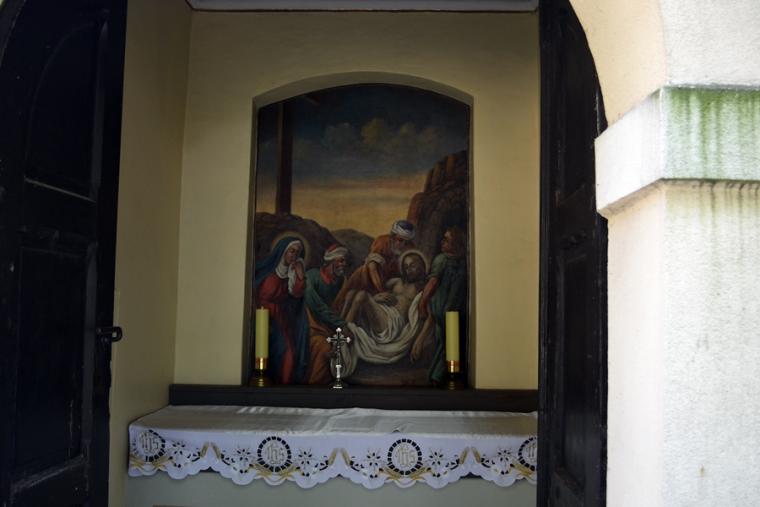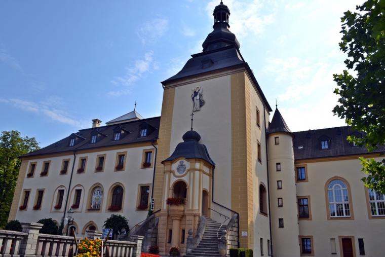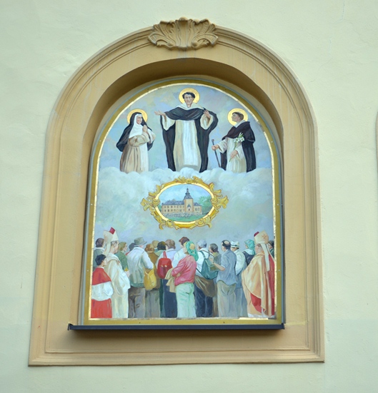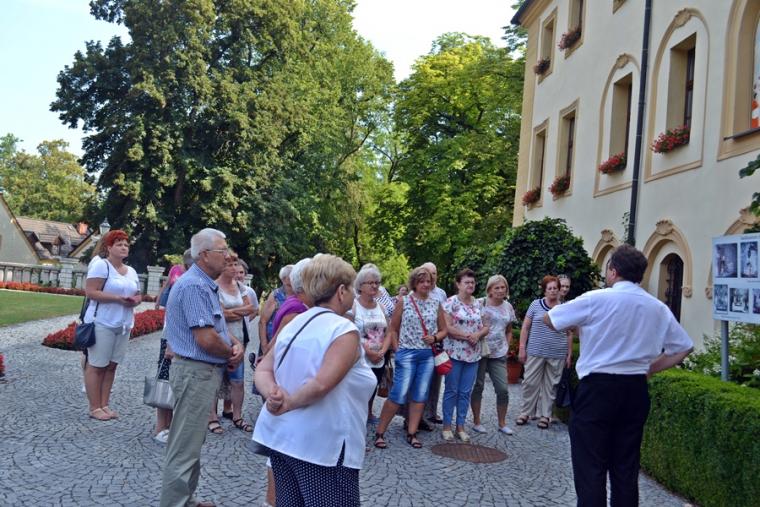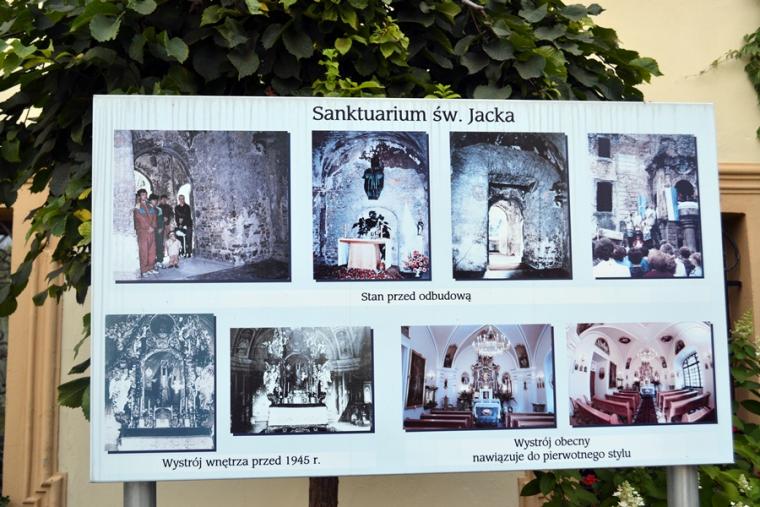 Kolejnym miejscem, które nawiedziliśmy był Kamień Śląski. Tu na świat przyszedł przyszły święty Jacek Odrowąż, bł. Czesław i bł. Bronisława. Kaplica poświęcona św. Jackowi powstała w XVIII wieku.  Zachwyca swoim wystrojem. W centralnym  punkcie ołtarza umieszczona jest  statua św. Jacka. Po jej bokach znajdują się figury bł. Czesława i bł. Bronisławy. Na sklepieniu kaplicy podziwiać można przepiękne malowidła przedstawiające cztery sceny z życia Maryi: „Zwiastowanie", „Narodziny Jezusa w Betlejem", „Ofiarowanie Jezusa w świątyni", „Śmierć Maryi-Wniebowzięcie". W kaplicy codziennie  od rana do zmierzchu odbywa się adoracja Najświętszego Sakramentu. Oczywiście nawiedziliśmy kaplicę sanktuarium św. Jacka, pokłoniliśmy się Jezusowi ukrytemu w Najświętszym Sakramencie. Wspólnie odmówiliśmy litanie do św. Jacka, a następnie był czas na indywidualna modlitwę oraz chwilę odpoczynku w parku pałacowym. Miejsce przepiękne, a niewielka kaplica stwarza atmosferę do refleksji i modlitewnej zadumy. Otaczający pałac park ze starymi drzewami i ptactwem pozwalał  zachwycić się pięknem świata stworzonego przez Boga. Przemierzając alejki, w cieniu drzew w niewielkiej kapliczce można było spotkać Chrystusa frasobliwego. Dobrze nam było u św. Jacka w Kamieniu Śląskim, ale trzeba było wyruszyć dalej na pielgrzymi szlak.