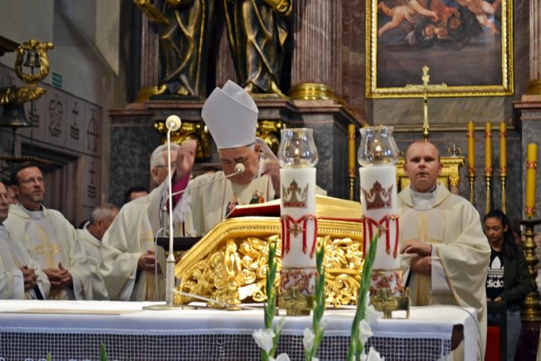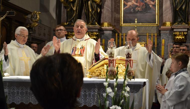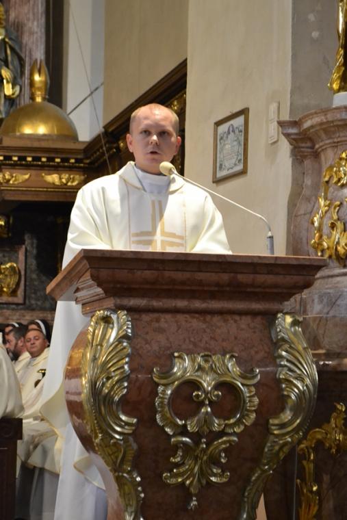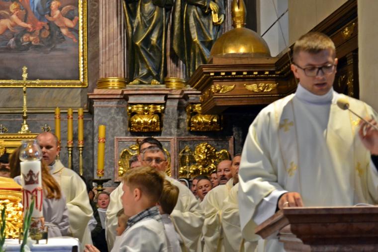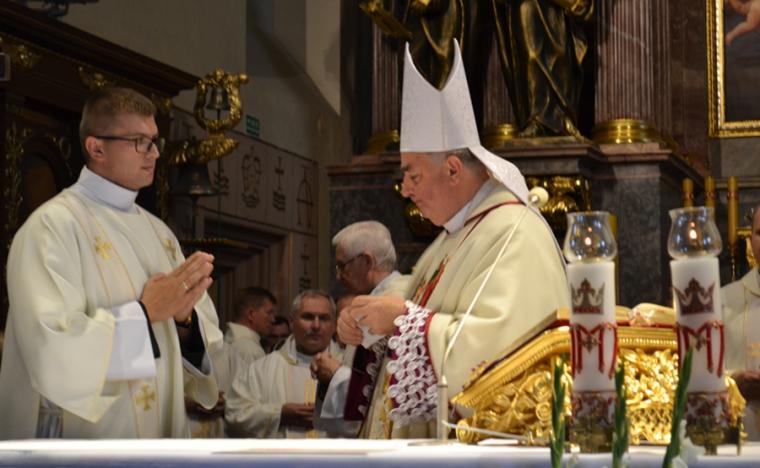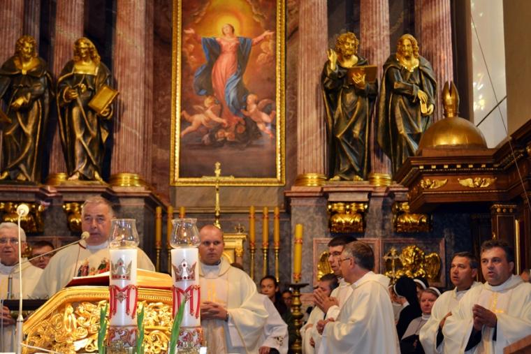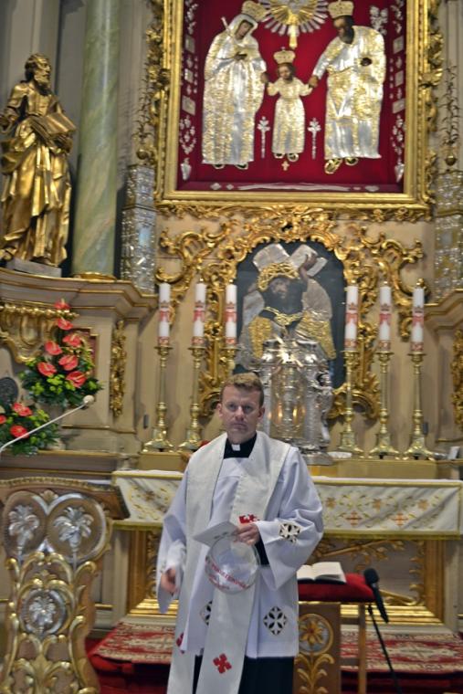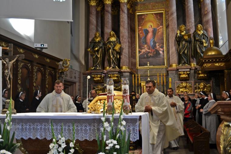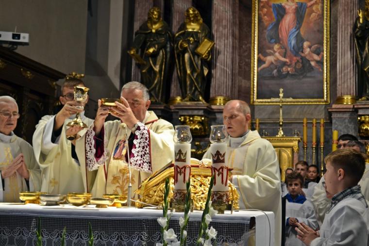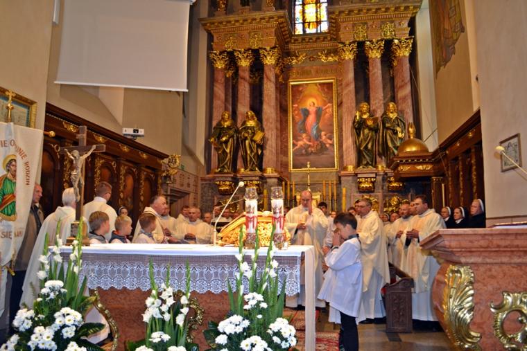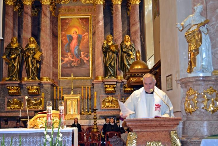 Po konferencji w Kaplicy Cudownego Obrazu zostało odprawione nabożeństwo do św. Józefa, które poprowadził ks. Michał Świgoniak. Ku niebu popłynęły słowa powitania św. Józefa, podziękowania za otrzymane łaski, ale także prośby, które w sobotnie przedpołudnie zostały złożone w sanktuarium. Po nich odmówiona została Litania do św. Józefa. Gdy zegar na wieży wybił godzinę dwunastą odśpiewany został Anioł Pański. Po modlitwie ks. prałat Jacek Plota, skierował słowa powitania do pielgrzymów. Najważniejszym punktem sobotniego spotkania ze Świętym Józefem była Eucharystia. Przewodniczył jej ks. prałat Jacek Plota, kustosz tego wyjątkowego miejsca, a współcelebransami kapłani przybyli z wiernymi ze swoich parafii. Homilię podczas Mszy św. wygłosił ks. Szymon Rybak. Rozpoczynając podkreślił, że nie jest przypadkiem, że znaleźliśmy się w Narodowym Sanktuarium Świętego Józefa właśnie w tym dniu. Zachęcał do tego, by poszukać samodzielnie odpowiedzi na pytania, po co się tutaj znaleźliśmy? Co św. Józef chce powiedzieć każdemu z nas? Nawiązując do słów Ewangelii (Łk8,4-15) podkreślił, że Pan Bóg jest tym, który sieje Słowo, niezależnie od tego, gdzie ono padnie, mając nadzieję, że wyda ono plon. Zaznaczył, że patrząc na życie św. Józefa widzimy, że jest ono żyzną glebą. Następnie ks. Szymon przywołał historię którą kiedyś usłyszał, a dotyczyła ona pytania, jakie konająca matka postawiła synowi kapłanowi: Czy ty naprawdę, żyjesz z Jezusem? Matka podkreśliła, że nie pyta syna kim jest, jakie ma znajomości, jaką ma władzę, ale czy naprawdę żyje z Jezusem. Kontynuując kaznodzieja podkreślił, że nie interesują go znajomości, pozycja społeczna, status materialny, decyzje, które mają do podjęcia zebrani w sanktuarium, ale interesuje go to czy naprawdę żyją z Jezusem. Jednocześnie podkreślił, że nie chodzi tutaj o deklaracje, ale o autentyczne życie wiarą. Ks. Szymon zachęcał, by szukać odpowiedzi na pytanie: kim jest dla nas Jezus, ale nie w deklaracji, tylko w konkretnych sytuacjach życiowych, podczas spotkań z różnymi ludźmi, w podejmowanych decyzjach. Podkreślał, że patrząc na św. Józefa widzimy, że nie składał Bogu wielkich deklaracji, ale cały czas żył słowem Bożym, mówił Bogu o swoich lękach.