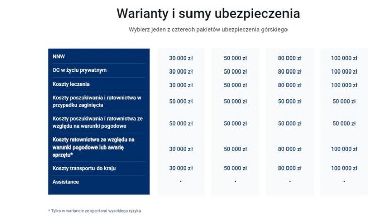 Oferta dostępna jest w dwóch wariantach: turystycznym i sportowym (z rozszerzeniem o sporty wysokiego ryzyka, wyczynowy udział w biegach górskich, w tym maratonach oraz ultramaratonach). Polisa obejmuje w sumie ponad 30 aktywności górskich. Zapewnia pomoc w postaci, organizacji i pokrycia kosztów leczenia, kosztów poszukiwania i ratownictwa (w razie potrzeby także z użyciem helikoptera) oraz opłacenie powrotu do kraju i usługi assistance, a także ubezpieczenia NNW (następstw nieszczęśliwych wypadków) i OC (odpowiedzialności cywilnej) w życiu prywatnym podczas aktywności objętych ubezpieczeniem.