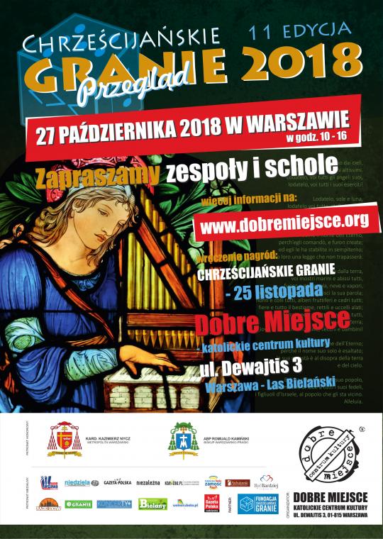 Zapraszamy na XI Przegląd Chrześcijańskie Granie dla młodzieżowych zespołów parafialnych i nie tylko. Młodzi wykonawcy, którzy grają podczas Mszy Świętych oraz wykonują szerzej pojętą muzykę chrześcijańską zaprezentują się przed profesjonalnym Jury. Profesjonaliści wskażą właściwą ścieżkę rozwoju artystycznego, przyznane zostaną także nagrody. Przegląd został objęty patronatem honorowym przez ks. kard. Kazimierza Nycza Abp Metropolity Warszawskiego i ks. bp. Romualda Kamińskiego Ordynariusza Diecezji Warszawsko-Praskiej.