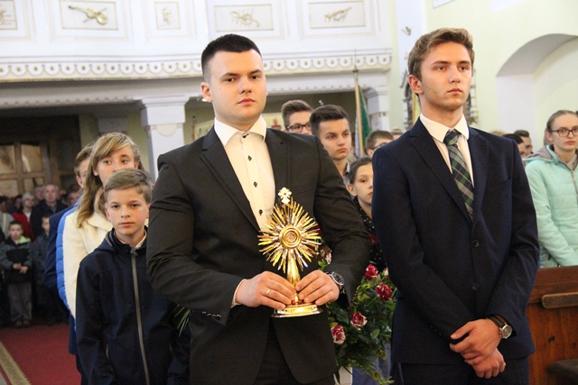 Relikwie bł. ks. Jerzego Popiełuszki zostały przyniesione w procesji z darami przez przedstawicieli rodziny zmarłego ks. prof. Antoniego Lewka.