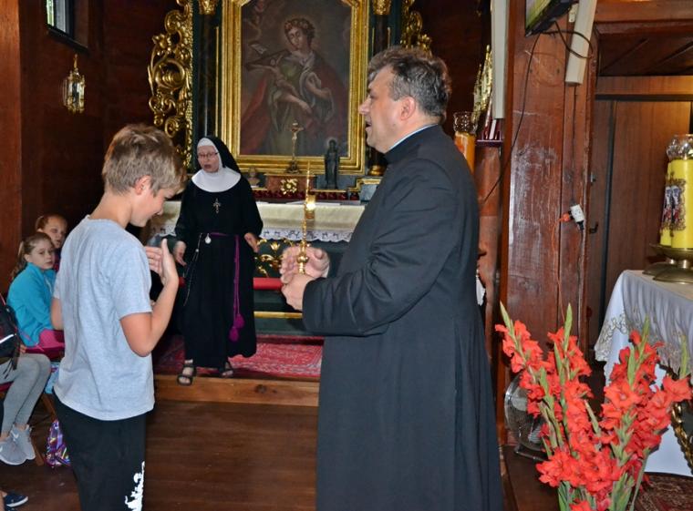Jak okazało się w drugim dniu spotkań, dzieci sumiennie wykonały pracę domową. Było jeszcze jedno zadanie, gdyż w trakcie tegorocznej Szkoły pojawił się kufer dziedzictwa. Podczas poszczególnych dni dzieci będą wkładały do niego rysunki, fotografie, opisy, tego co składa się na nasze dziedzictwo kulturowe. Na początek dzieci miały przyjrzeć się dziedzictwu należącemu do nich. Kufer w czwartkowe przedpołudnie zaczął się wypełniać. W tym drugim dniu w Rochowej Szkole był oczywiście czas na modlitwę nowennową podczas której ks. kan. Krzysztof odczytywał przyniesione przez młodych intencje. Potem dzieci uczciły relikwie św. Rocha. Po modlitwie przyszedł czas na wspólny śpiew. W jego prowadzeniu niezastąpiona okazała się s. Małgorzata, która pewnie już do końca spotkań w Rochowej Szkole będzie dbała o to, by rozśpiewać dzieci, a także organizować dla nich zabawy ruchowe.Ta wakacyjna szkoła została zorganizowana m.in. po to, by dzieci poznały życie św. Rocha, a także wartości, którymi kierował się On w swoim życiu. W tym celu ksiądz kustosz wykorzystał fragment programu „Ziarno” poświęconego św. Rochowi. Dodajmy, że fragmenty tego programu były realizowane na terenie naszej parafii. Uczestniczyli w nim młodzi Mikstaczanie. W drugim dniu omówione zostały atrybuty, z którymi na obrazach i rzeźbach przedstawiany jest św. Roch. Stało się to impulsem do wskazania podobieństw i różnic w ikonograficznych przedstawieniach św. Rocha i św. Jakuba. Podczas spotkania dzieci obejrzały film animowany „N- jak niewidomy”, w którym mogły zobaczyć w jaki sposób można pomagać osobom niewidomym bądź niedowidzącym. Ksiądz kustosz omawiając strój św. Rocha zwrócił uwagę na laskę pielgrzymią. Z filmu dzieci dowiedziały się, że biała laska może być bardzo pomocna dla osoby niewidomej. Nie zabrakło także opowieści o psach przewodnikach osób niewidomych. Film był forma przygotowania do spotkania z gościem, który tego dnia odwiedził uczestników Szkoły Świętego Rocha. Mamy nadzieję, że spotkanie to na długo pozostanie w ich pamięci. Kim był ten niezwykły gość? Otóż na spotkanie z młodymi przybyła Pani Gabriela Przygoda. Pani Gabriela jest osobą niewidomą, straciła wzrok mając 20 lat. Podczas spotkania Pani Gabrysia przedstawiła się w kilku zdaniach, a następnie bardzo chętnie odpowiadała na pytania młodych, trzeba przyznać, że było ich bardzo wiele. Młodzi pytali m.in. o to jak radzi ona sobie z czynnościami dnia codziennego takimi jak sprzątanie, gotowanie, prasowanie, mycie, poruszanie się po mieszkaniu, dobieranie kolorystyki ubrania, pakowanie walizki na wyjazd. Pani Gabrysia podkreślała, że pomocne są tu często zdobycze techniki. Podkreśliła, że osoby niewidome mają z reguły bardzo uporządkowane życie. Troska o ład ułatwia im funkcjonowanie, gdyż wiedzą wtedy gdzie mogą znaleźć konkretne przedmioty. Jest jeszcze jedna rzecz, którą należy powiedzieć o gości. Pani Gabriela została obdarowana przez Pana Boga pięknym głosem. Dane nam było posłuchać w sanktuarium pieśni Ave Maria Jasnogórska Pani. Może kiedyś uda się Pani Gabrysi wydać płytę, życzymy jej tego z całego serca. Po licznych pytaniach zadanych przez młodych ksiądz kan. Krzysztof zapytał Panią Gabrysię co chciałaby powiedzieć młodym ludziom. Zacytujmy to przesłanie: „Żeby żyli każdym dniem, żyli tak, żeby nikt przez nich nie płakał, bo jeżeli jest się młodym nie zwraca się uwagi na to co się robi, krzywdzi się ludzi, to to wszystko potem wraca, jeżeli się ich nie krzywdzi, a stanie się nam krzywda to ma się pomoc z każdej strony, ale jeśli się tego nie zauważa i tego nie robi to wtedy jest naprawdę ciężko”.