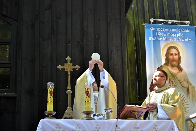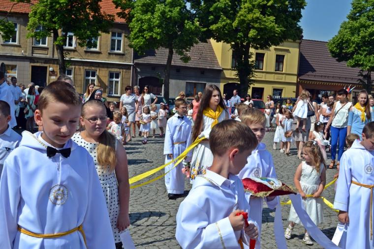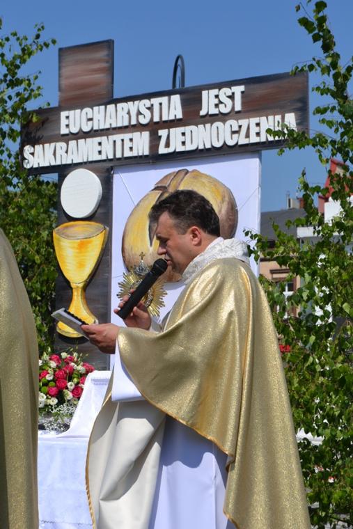 Wracając do głównego wątku rozważania kaznodzieja zachęcał wiernych do postawienia sobie pytania: „Co Jezus ukryty pod postacią Chleba, zobaczy w czasie wędrowania przez nasze miasto i parafię? Jaką zobaczy Ojczyznę, jaki Kościół, jaką rodzinę, jakiego człowieka?”. W dalszej części homilii celebrans podkreślił, że uroczystość Bożego Ciała jest wielkim pokłonem złożonym Jezusowi, ale jednocześnie zachęcał, by odpowiedzieć sobie na pytanie, czy zawsze oddajemy Bogu pokłon. Zaznaczył, że różnie z tym bywa. Myślą przewodnią rozważania były słowa pieśni „ Zróbcie Mu miejsce…”. Kończąc rozważanie ks. kanonik powiedział: „ Mam do Was ogromną prośbę w tym roku, abyśmy zrobili Bogu miejsce w naszych kalendarzach, które są tak mocno zapełnione różnymi sprawami”. Parafia podzielona jest na rejony, jak podkreślił ks. proboszcz nie tylko po to, by wywiązywały się one m.in. z organizacji procesji w poszczególnych dniach, ale i po to, by ich mieszkańcy w tych dniach uczestniczyli w Eucharystii. Jak odpowiemy na to zaproszenie? Czy zrobimy miejsce dla Pana w naszych sercach i w naszych kalendarzach. Tak wielu z nas przyjęło Jezusa w Komunii Świętej. Zrobiliśmy Mu miejsce w naszych sercach. Po Mszy Świętej odbyło się wystawienie Najświętszego Sakramentu, następnie wraz z Jezusem ukrytym pod postacią Chleba wyruszyliśmy w procesji do czterech ołtarzy. Przedstawiciele poszczególnych regionów przygotowali ołtarze. Trasa tegorocznej procesji wiodła od Diecezjalnego Sanktuarium Świętego Rocha do krzyża misyjnego przy naszej farze, której 100- lecie konsekracji przeżywać będziemy w październiku. Jak to już staje się tradycją w naszej wspólnocie co roku procesja odbywa się inna trasą, bo Jezus przychodzi do wszystkich. Przy poszczególnych ołtarzach wsłuchiwaliśmy się w rozważania, których myślą przewodnia była EUCHARYSTIA. Na pierwszym ołtarzu znajdowało się hasło: Eucharystia jest Ofiarą. W słowach rozważania usłyszeliśmy m.in. „ W opisie Eucharystii bardzo ważne są cztery czasowniki: brać, błogosławić, łamać, dawać. Dzięki nim możemy zaobserwować, na czym polega logika ofiary Jezusa”. O tym jak wielka jest tajemnica Boga i o Eucharystii jako pokarmie dla duszy mowa była w rozważaniu przy drugim ołtarzu. Na trzecim ołtarzu widniało hasło: „Eucharystia jest sakramentem zjednoczenia”. Tu do wiernych popłynęło przesłanie: „ Ten, który pokonał śmierć może wejść pomimo drzwi zamkniętych, pomimo zakrytych bielmem oczu i zatwardziałych serc. Wówczas, gdy On wychodzi nam naprzeciw , ukazuje się jako żyjący, dający życie”. Hasło na trzecim ołtarzu zachęcało nas do spojrzenia na Eucharystię jako zadatek nieśmiertelności. Tu wybrzmiało także Te Deum laudamus. Procesję zakończyło błogosławieństwo Najświętszym Sakramentem na cztery strony świata. Podczas procesji niesione były sztandary i feretrony. Uroczystość uświetniła orkiestr parafialna i chór. A tuż przed baldachimem kroczyły dziewczęta sypiące kwiatki. Było ich podczas tegorocznej procesji bardzo dużo. Jezus ukryty pod postacią Chleba przemierzał ulice naszego miasteczka obsypywany płatkami kwiatków.
