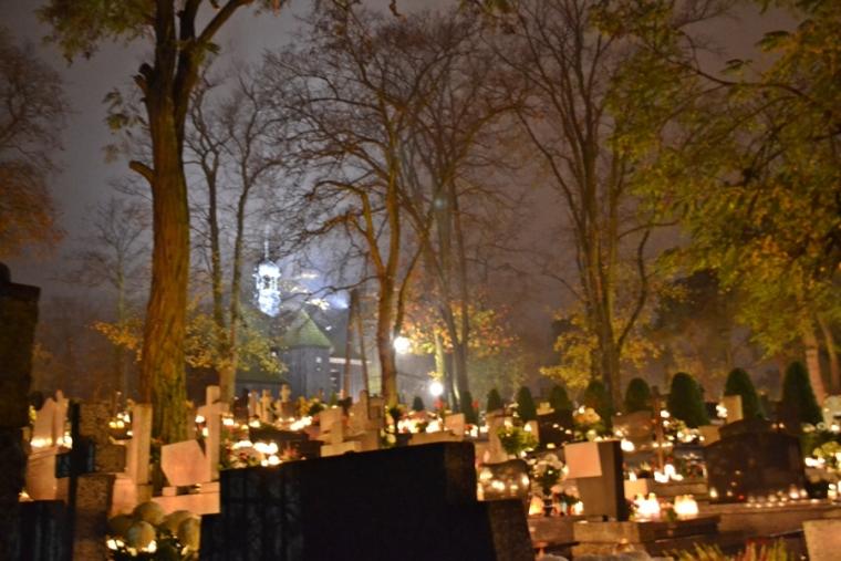 Głęboka w treści i zachęcająca do refleksji, ale i przemiany życia była ta przytoczona w rozważaniu legenda. Czy potrafimy odwiedzić, pocieszyć, dodać otuchy, być przy człowieku pogrążonym w smutku, płaczącym, biednym, głodnym, pragnącym sprawiedliwości. Czy potrafimy zdobyć się na zwykły ludzki gest? Być może to właśnie od tych zwykłych, pozornie nic nie znaczących gestów świadczących o miłości wobec bliźnich będzie zależało co usłyszymy od Boga, gdy przyjdzie nam zdać sprawę z naszego życia. Pan ofiarował nam czas, ale także przykład życia tak wielu świętych. Oni mogli osiągnąć świętość, możemy i my. Czy osiągniemy? Po Mszy Świętej alejkami wokół Sanktuarium wyruszyła procesja, podczas której przy pięciu stacjach modliliśmy się za zmarłych: kapłanów, biskupów, papieży, za rodziców, rodzeństwo, dziadków, krewnych, przyjaciół. Przy trzeciej stacji modlitwą objęliśmy zmarłych parafian, sąsiadów. Nie zabrakło także modlitwy w intencji tych, których miejsca wiecznego spoczynku nie znamy, a także za tych którzy zginęli obozach koncentracyjnych. Przy piątej stacji modliliśmy się za wszystkich zgromadzonych na cmentarzu prosząc dla nich o pragnienie osiągnięcia świętości. Modlitwą objęta została także ta osoba, którą jako pierwszą spośród zebranych Pan powoła do siebie. Nie wiemy kto to będzie, to wie tylko Bóg. Niewątpliwie modlitwa przy tej stacji stanowiła okazję do tego, by zadać sobie pytanie- czy jestem przygotowany ( przygotowana) na spotkanie z Panem. Uroczystość uświetniła orkiestra parafialna. O godz. 19:00 w sanktuarium spotkaliśmy się na modlitwie różańcowej połączonej z wypominkami. Mimo padającego deszczu jeszcze w późnych godzinach wieczornych wielu przemierzało cmentarne alejki, zatrzymując się przy grobach bliskich, przyjaciół, znajomych. Ofiarowana modlitwa, położone na grobach kwiaty, płonące lampki są dowodem na to, że o nich pamiętamy…