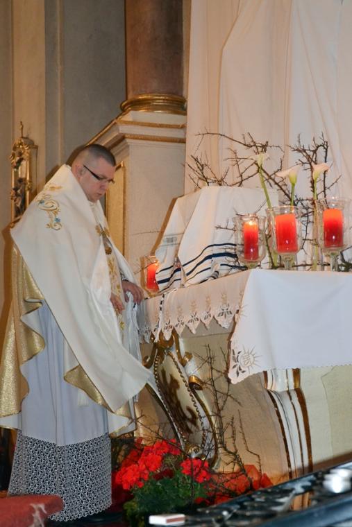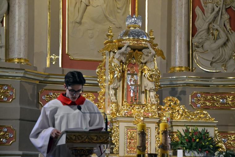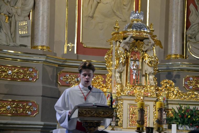 Homilię podczas Mszy Wieczerzy Pańskiej wygłosił ks. Marcin, który na początku ukazał jak wyglądały przygotowanie do tradycyjnej paschy żydowskiej. Zwrócił uwagę na szczególna troskę o baranka, którego następnie zabijano, bo potrzebna była krew do dopełnienia obrzędu paschy. Nawiązując do Ewangelii zwrócił uwagę, że Jezus spożył wieczerzą z uczniami przed paschą. Podkreślił, że Jezus swoją paschę odbędzie w Wielki Piątek. Kontynuując kaznodzieja zapytał: „ Czym zatem jest to co Jezus uczynił uczniom podczas wieczerzy”? Odpowiadając nawiązał do pierwszego cudu w Kanie Galilejskiej, gdzie puste stągwie, które Jezus kazał napełnić wodą, które zamienił w wino. Woda, tym razem w miednicy, pojawiła się i odgrywa ważną rolę podczas wieczerzy. Kapłan powiedział: „Skoro Jezus spożywa wieczerzę, którą wyprzedza Jego paschę i zamyka w znak, to co my czynimy po dzisiejszy dzień w Eucharystię tzn. że jest to tą sama woda, która zalała grzech Egiptu, kiedy Izraelici uciekali przez suche Morze Czerwone i to ta sama woda, którą Jezus zamienił w wino w Kanie Galilejskiej, to ta sama woda, i to też ta sama woda, która wypłynie z boku Jezusa, gdy Go zabijemy”. Kontynuując ks. Marcin wyjaśnił znaczenie gestu obmycia nóg. Zwracając uwagą na opór Szymona zaakcentował, że to ważny moment dla każdego z nas. Wymaga przyznania się do tego, że potrzebujemy obmycia. Dodał, że jest jeszcze jedna woda, woda Chrztu świętego, która zmywa nas z grzechu. Jednak nadal grzech jest w nas. Dopiero obmycie przez Chrystusa , którym jest Jego śmierć, uwalnia nas od grzechu. Kapłan zaapelował do zebranych: „ Pozwólcie dzisiaj obmyć wasze serca wodą, która stanie się Krwią Chrystusa przelaną za nas na krzyżu. Jezus dzisiaj wino z Kany Galilejskiej przemienił w swoją krew, ale to od naszego serca zależy za kim pójdziemy”. Kontynuując ks. Marcin podkreślił, że to od nas zależy za kim pójdziemy. Podkreślił, że jeśli pozwolimy, by nad naszymi sercami zapanował zły duch, to w naszym życiu nie będzie miejsca na gest obmycia nóg, oczyszczenia i przemianę naszych serc. Kapłan zachęcał zebranych, by zastanowili się co w naszym życiu wymaga przemiany, obmycia w krwi Chrystusa. Kończąc kaznodzieja powiedział: „Niech ta woda, która za chwilę popłynie na nowo oczyści nasze serca, by nie gościł tam strach, przed chęcią zmiany, by nie gościła tam niepewność, czy z Bogiem uda nam się naprawić nasze życie, ale by ta woda, która jest krwią Boga zmyła z nas to co zostawia w nas zły duch, byśmy mogli w końcu wrócić do Boga czystymi stopami naszych serc. Amen”.