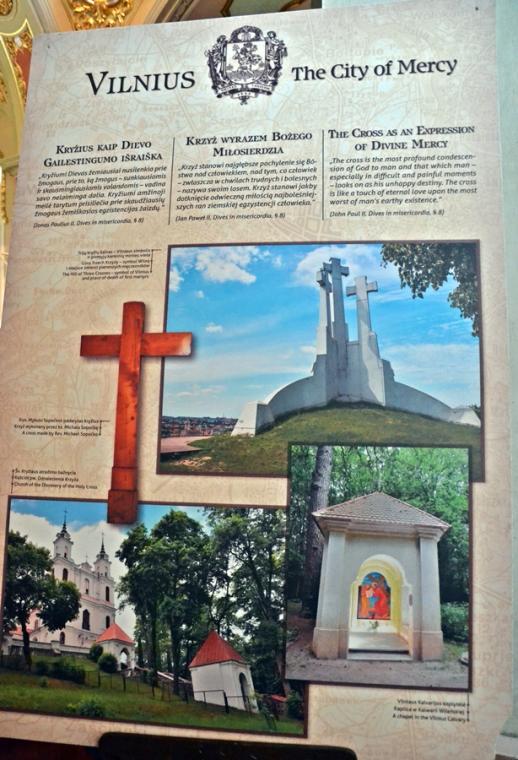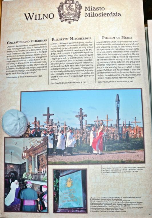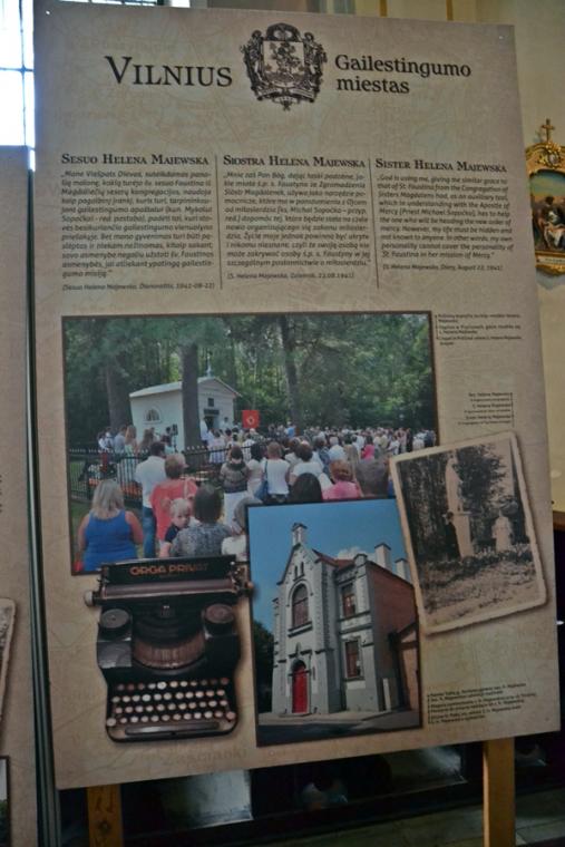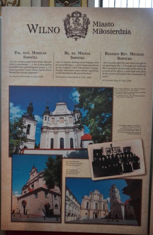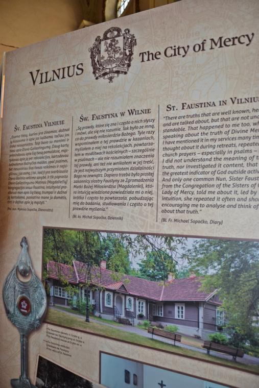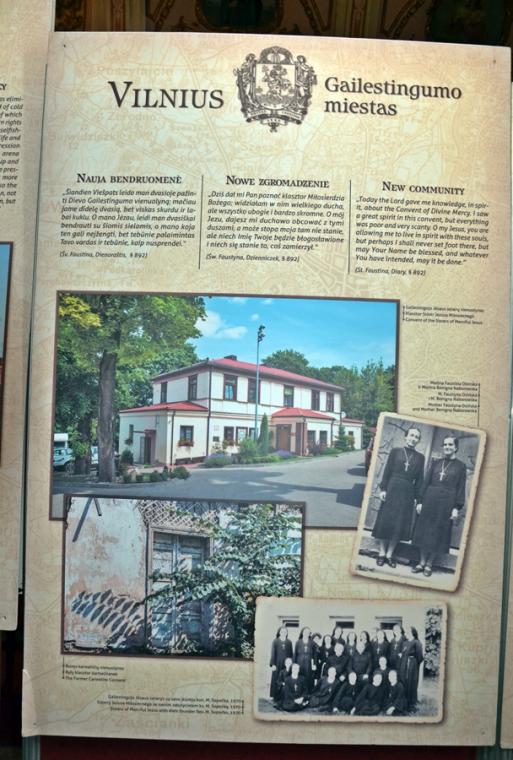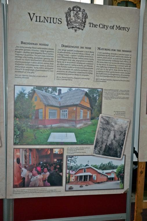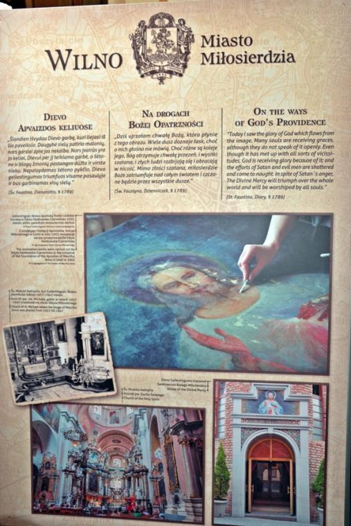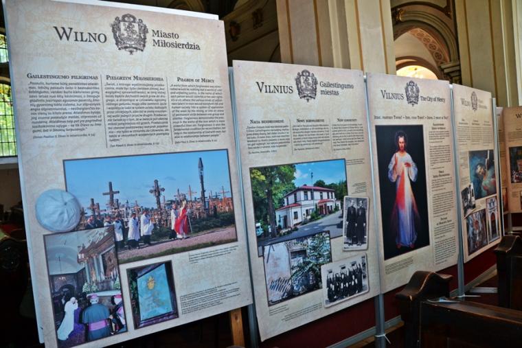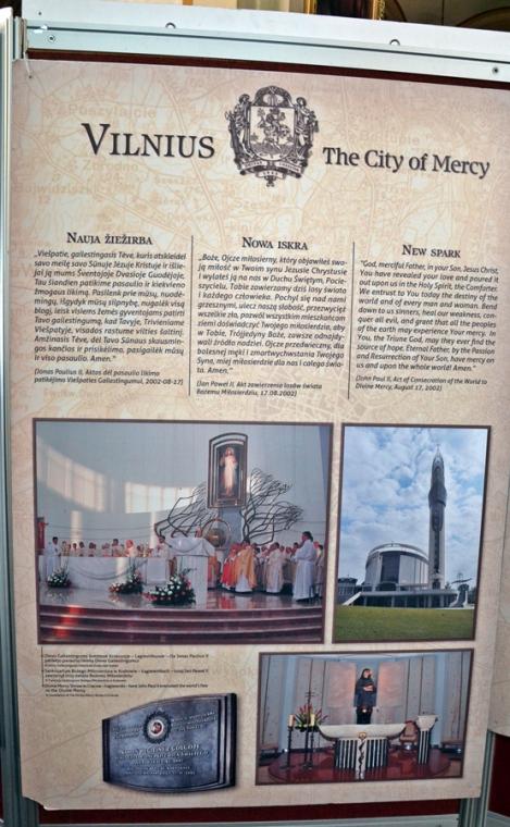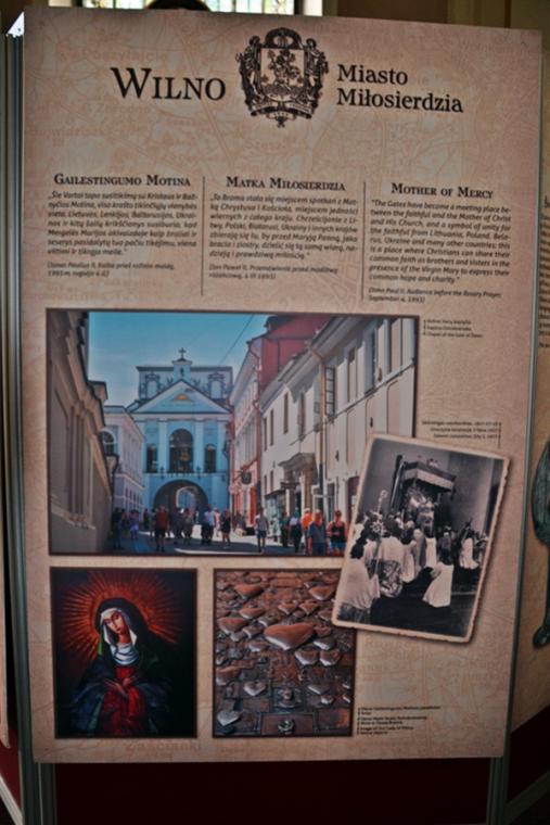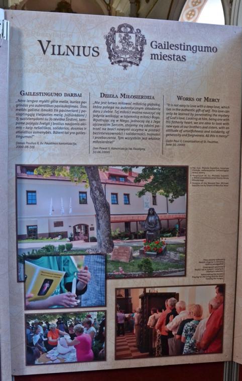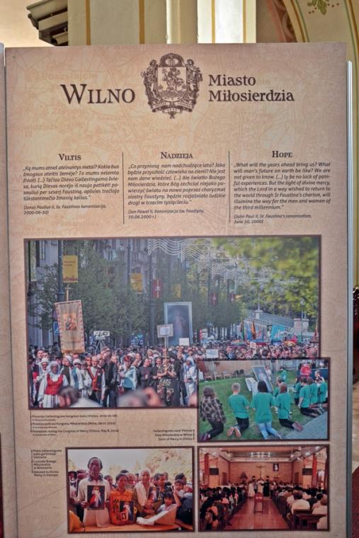 Ponadto w lipcu organizowana jest z parafii pielgrzymka do Wilna. Wystawa ma więc zachęcić do wyruszenia na pielgrzymi szlak, a tym którym nie będzie to dane przybliżyć miejsca związane z kultem Bożego miłosierdzia. Jest ich jak możemy się przekonać oglądając wystawę bardzo wiele. Pomysłodawcą wystawy jest ks. Mariusz Marszałek, były sekretarz ks. Abp Wilna Gintarasa Grusasa. Po raz pierwszy została zaprezentowana w Senacie w 2016 roku. Autorem zdjęć jest artysta i fotograf Marian Dzwinel. Wystawa składa się z 16 plansz, na których umieszczone są zdjęcia i teksty w trzech językach polskim, litewskim, i angielskim. Oto niektóre tytuły prezentowanych na wystawie plansz: Apostołka Bożego Miłosierdzia, Święta Faustyna  w Wilnie, Matka Miłosierdzia, Nadzieja, Dzieła Miłosierdzia, Na drogach Bożej Opatrzności, Obraz Jezusa Miłosiernego, Nowe zgromadzenia, Krzyż wyrazem Bożego miłosierdzia  i kilka innych. Na jeszcze jedną chcemy zwrócić uwagę – Nowa iskra, a na niej Sanktuarium Miłosierdzia Bożego i tekst  Aktu zawierzenia losu świata Miłosierdziu Bożemu przez św. Jana Pawła II. Dodajmy, że każda plansza zawiera opis miejsca, bądź fragment z Dzienniczka św. S. Faustyny, czy pamiętnika, listów bł. Michała Sopoćko.