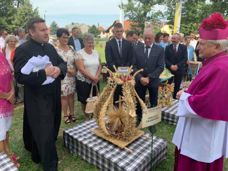 Po Eucharystii starostowie dożynek: Monika i Karol Grzeszczyk z Rudy w gminie Zduny oraz starostowie pomocniczy Agnieszka Kaj i Jan Jaskuła z Lutogniewa oraz Małgorzata Ziętek z Fijałowa i Bronisław Koncewicz z Długołęki w gminie Kobylin złożyli bochen chleba na ręce biskupa kaliskiego Edwarda Janiaka, kustosza Sanktuarium Matki Bożej Pocieszenia w Lutogniewie ks. kan. Łukasza Żurawskiego i starosty krotoszyńskiego Stanisława Szczotki. W swoim wystąpieniu biskup kaliski prosił, aby młode pokolenia uczyć miłości do ziemi: „Dzisiaj trzeba mówić dzieciom i wnukom o przodkach. Trzeba uczyć miłości do ojczyzny. Dzisiaj, kiedy jesteśmy w Europie i napływają do nas te wszystkie trendy, również negatywne to bardzo ważne jest, aby pielęgnować wiarę, uczyć modlitwy. W tej wielkiej Europie jesteśmy taką gwiazdą nadziei tradycji, świętości, miłości do Kościoła i ojczyzny.”.