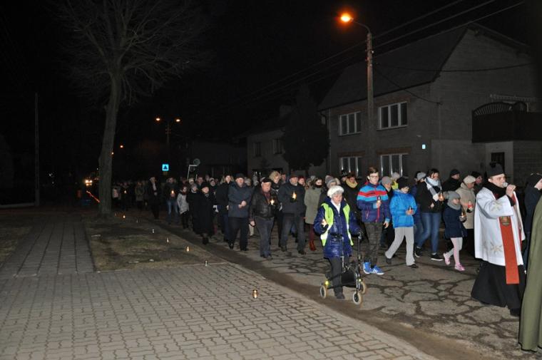 Pomiędzy poszczególnymi stacjami odmawialiśmy tajemnice różańca, Koronkę do Miłosierdzia Bożego, śpiewaliśmy pieśni wielkopostne. Modliliśmy się o dobrą spowiedź, ale także objęliśmy modlitwa naszych chorych parafian, którym stan zdrowia uniemożliwił udział w Drodze Krzyżowej.Modlitwie przewodniczył ks. proboszcz. Przy sanktuarium ks. proboszcz wraz z ks. wikariuszem udzielili zebranym błogosławieństwa. Przy śpiewie pieśni „Witaj Królowo…” uczestnicy nabożeństwa udali się na groby swoich bliskich, by tam w duchu wdzięczności za przekazaną wiarę zatrzymać się na chwilę modlitwy, a także postawić niesiony podczas drogi krzyżowej znicz, symbol pamięci.